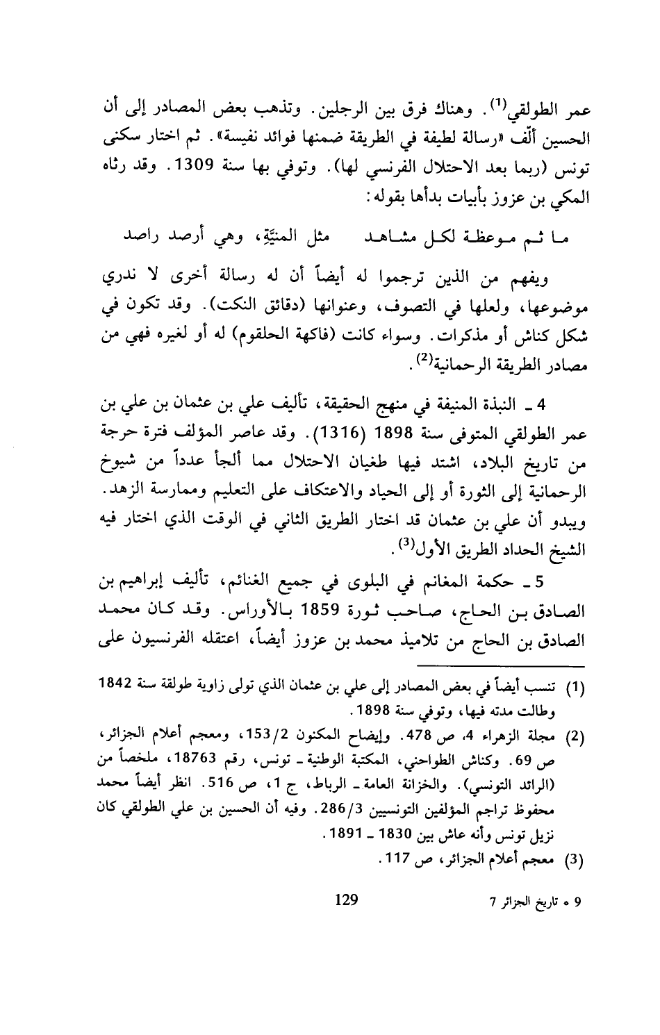 (¬2) مجلة الزهراء 4، ص 478. وإيضاح المكون 2/ 153، ومعجم أعلام الجزائر، ص 69. وكناش الطواحني، المكتبة الوطنية - تونس، رقم 18763، ملخصا من (الرائد التونسي). والخزانة العامة - الرباط، ج 1، ص 516. انظر أيضا محمد محفوظ تراجم المؤلفين التونسيين 3/ 286. وفيه أن الحسين بن علي الطولقي كان نزيل تونس وأنه عاش بين 1830 - 1891.