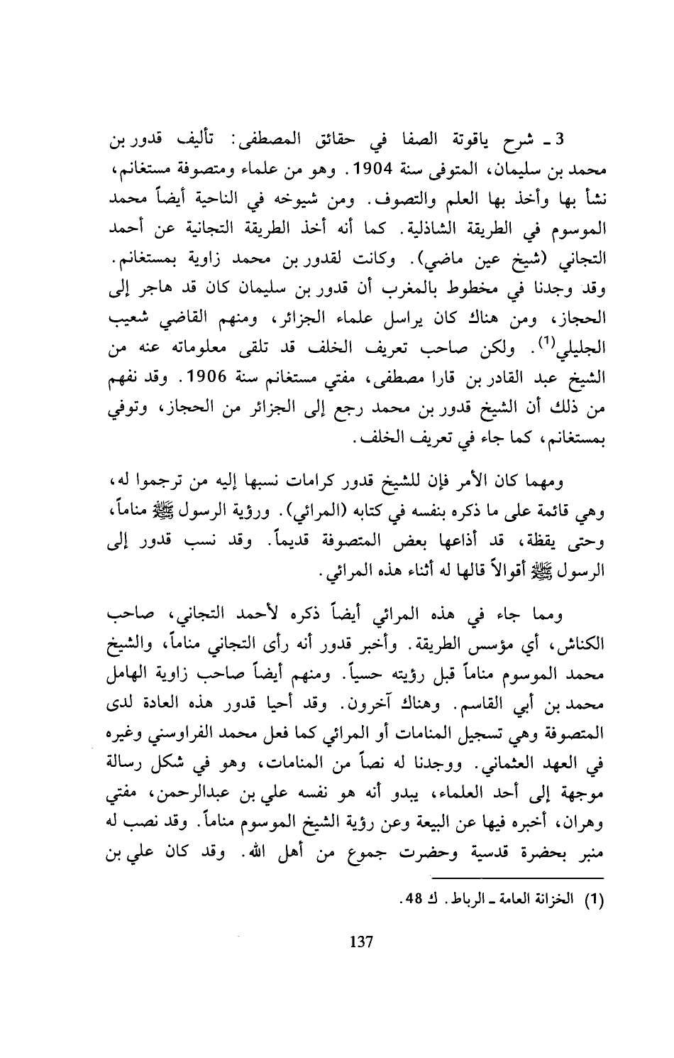 3 - شرح ياقوتة الصفا في حقائق المصطفى: تأليف قدور بن محمد بن سليمان، المتوفى سنة 1904. وهو من علماء ومتصوفة مستغانم، نشأ بها وأخذ بها العلم والتصوف. ومن شيوخه في الناحية أيضا محمد الموسوم في الطريقة الشاذلية. كما أنه أخذ الطريقة التجانية عن أحمد التجاني (شيخ عين ماضي). وكانت لقدور بن محمد زاوية بمستغانم. وقد وجدنا في مخطوط بالمغرب أن قدور بن سليمان كان قد هاجر إلى الحجاز، ومن هناك كان يراسل علماء الجزائر، ومنهم القاضي شعيب الجليلي (¬1). ولكن صاحب تعريف الخلف قد تلقى معلوماته عنه من الشيخ عبد القادر بن قارا مصطفى، مفتي مستغانم سنة 1906. وقد نفهم من ذلك أن الشيخ قدور بن محمد رجع إلى الجزائر من الحجاز، وتوفي بمستغانم، كما جاء في تعريف الخلف.