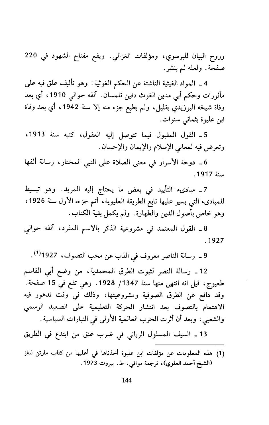 (¬1) هذه المعلومات عن مؤلفات ابن عليوة أخذناها في أغلبها من كتاب مارتن لغز (الشيخ أحمد العلوي)، ترجمة موافي، ط. بيروت 1973.