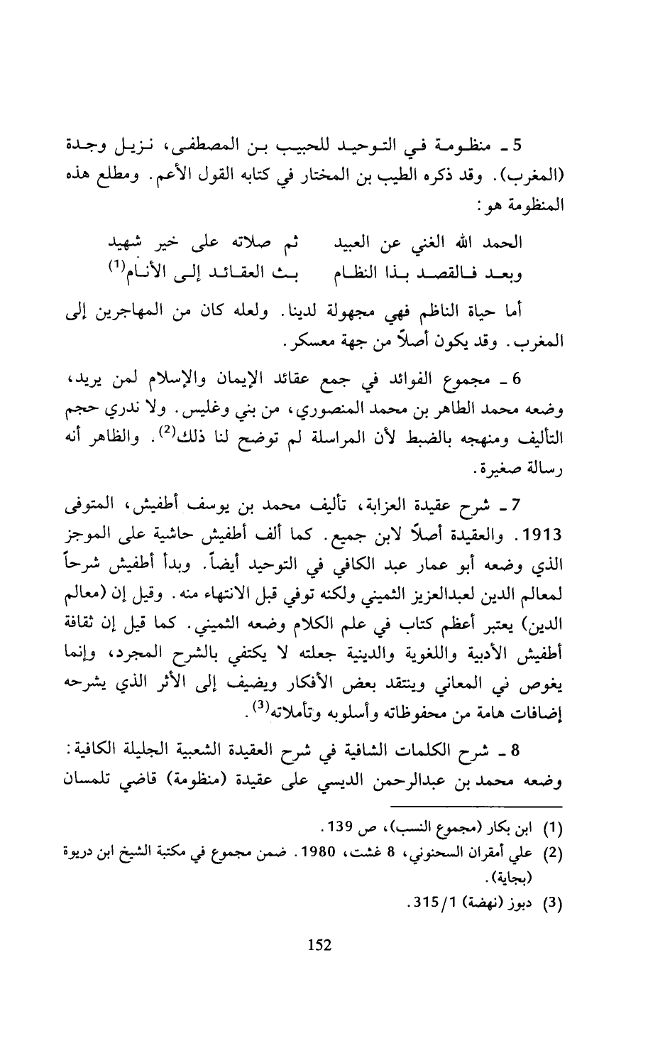 6 - مجموع الفوائد في جمع عقائد الإيمان والإسلام لمن يريد، وضعه محمد الطاهر بن محمد المنصوري، من بني وغليس. ولا ندري حجم التأليف ومنهجه بالضبط لأن المراسلة لم وضح لنا ذلك (¬2). والظاهر أنه رسالة صغيرة.