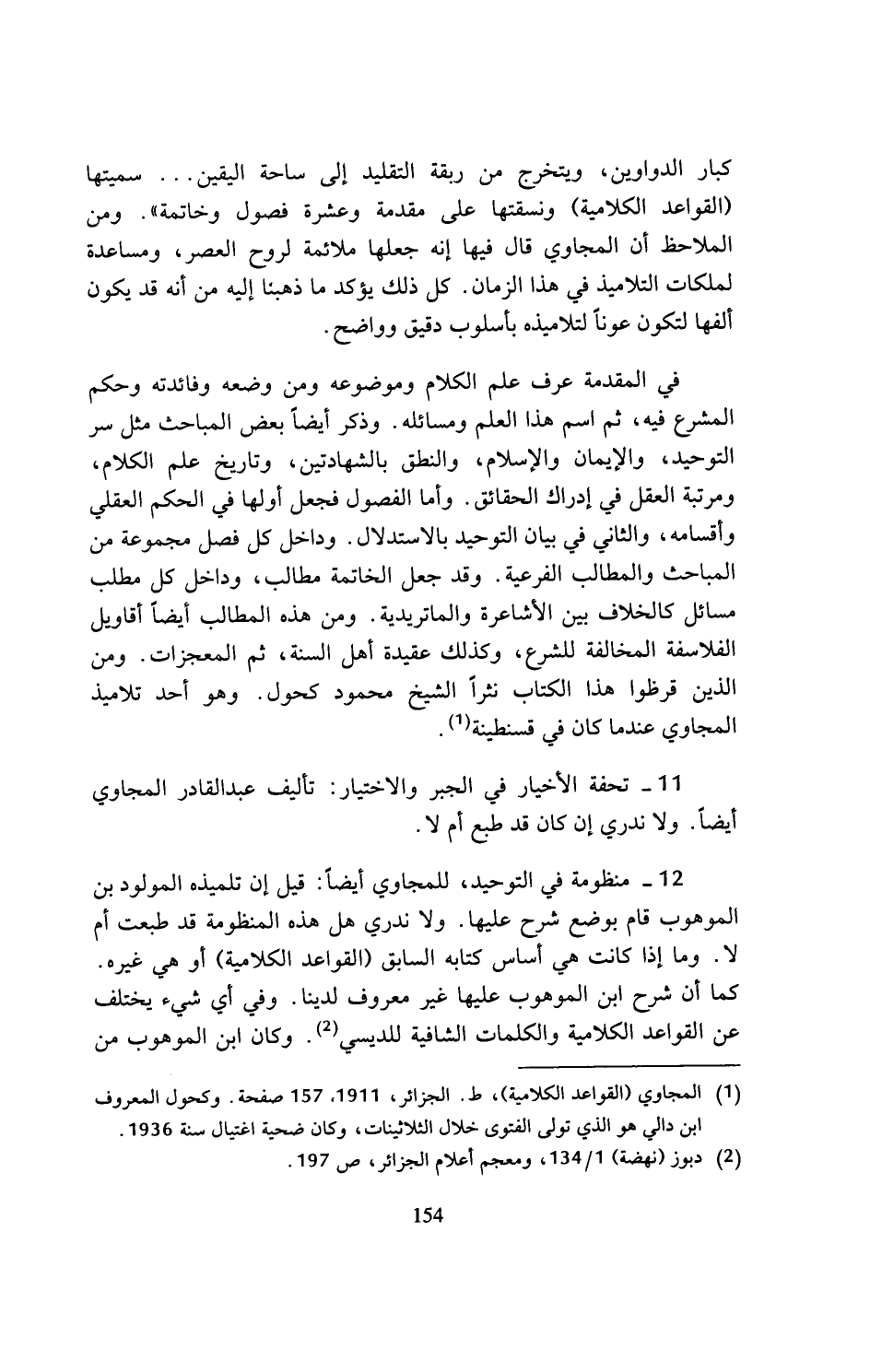 12 - منظومة في التوحيد، للمجاوي أيضا: قيل إن تلميذه المولود بن الموهوب قام بوضع شرح عليها. ولا ندري هل هذه المنظومة قد طبعت أم لا. وما إذا كانت هي أساس كتابه السابق (القواعد الكلامية) أو هي غيره. كما أن شرح ابن الموهوب عليها غير معروف لدينا. وفي أي شيء يختلف عن القواعد الكلامية والكلمات الشافية للديسي (¬2). وكان ابن الموهوب من