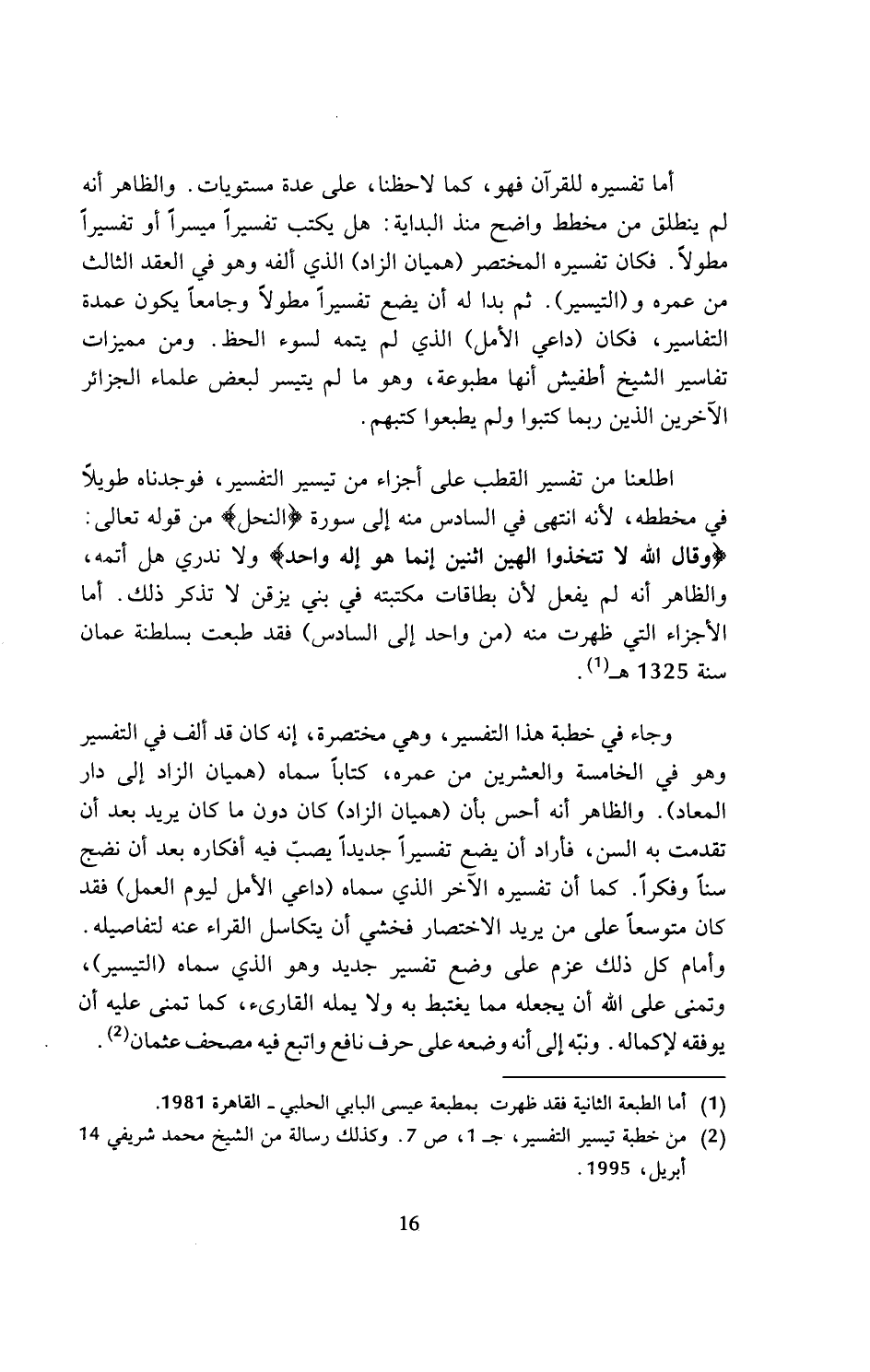 اطلعنا من تفسير القطب على أجزاء من تيسير التفسير، فوجدناه طويلا في مخططه، لأنه انتهى في السادس منه إلى سورة (النحل) من قوله تعالى: {وقال الله لا تتخذوا الهين اثنين إنما هو إله واحد} ولا ندري هل أتمه، والظاهر أنه لم يفعل لأن بطاقات مكتبته في بني يزقن لا تذكر ذلك. أما الأجزاء التي ظهرت منه (من واحد إلى السادس) فقد طبعت بسلطنة عمان سنة 1325 (¬1).