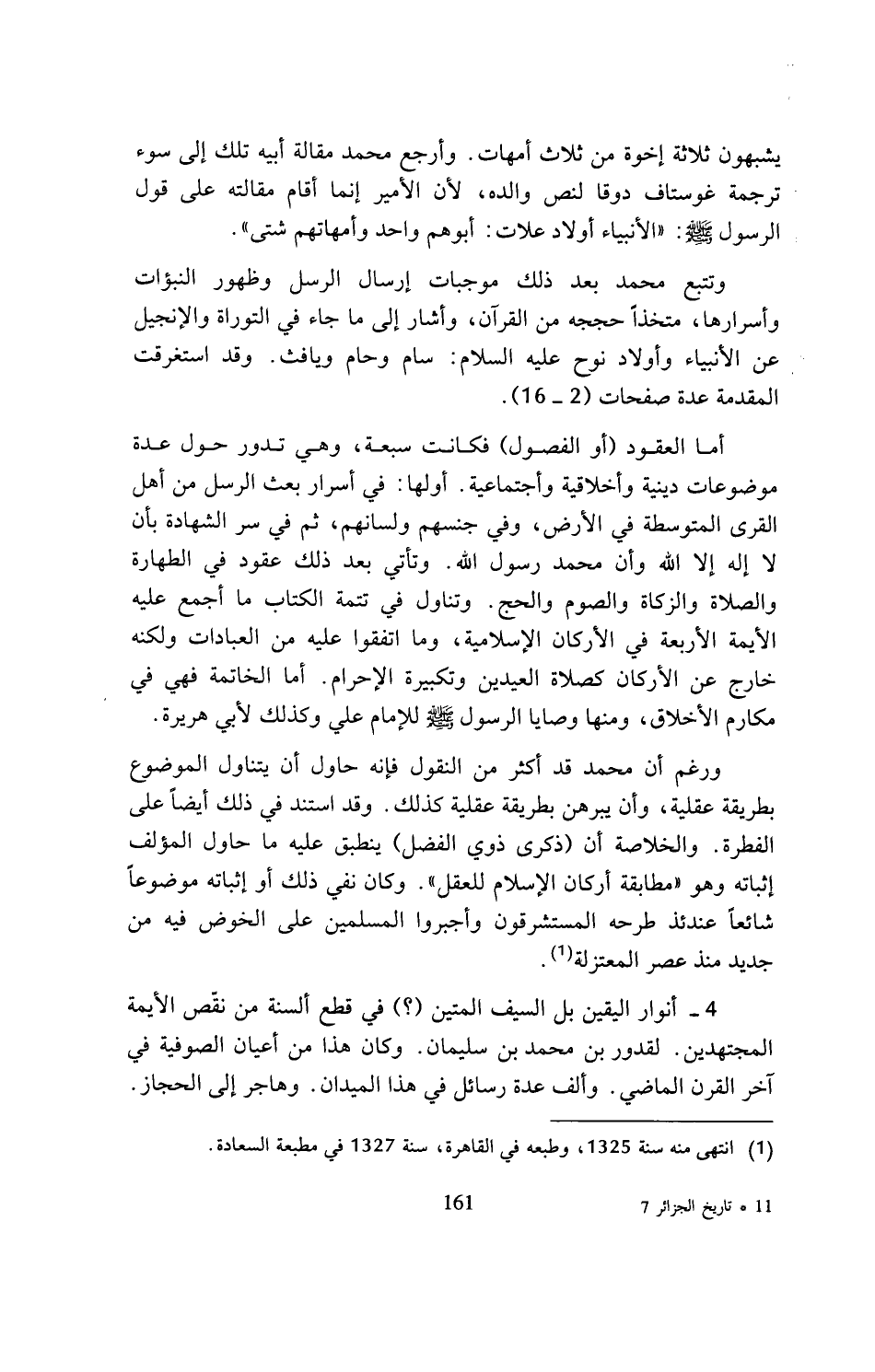 4 - أنوار اليقين بل السيف المتين (؟) في قطع ألسنة من نقص الأيمة المجتهدين. لقدور بن محمد بن سليمان. وكان هذا من أعيان الصوفية في آخر القرن الماضي. وألف عدة رسائل في هذا الميدان. وهاجر إلى الحجاز.