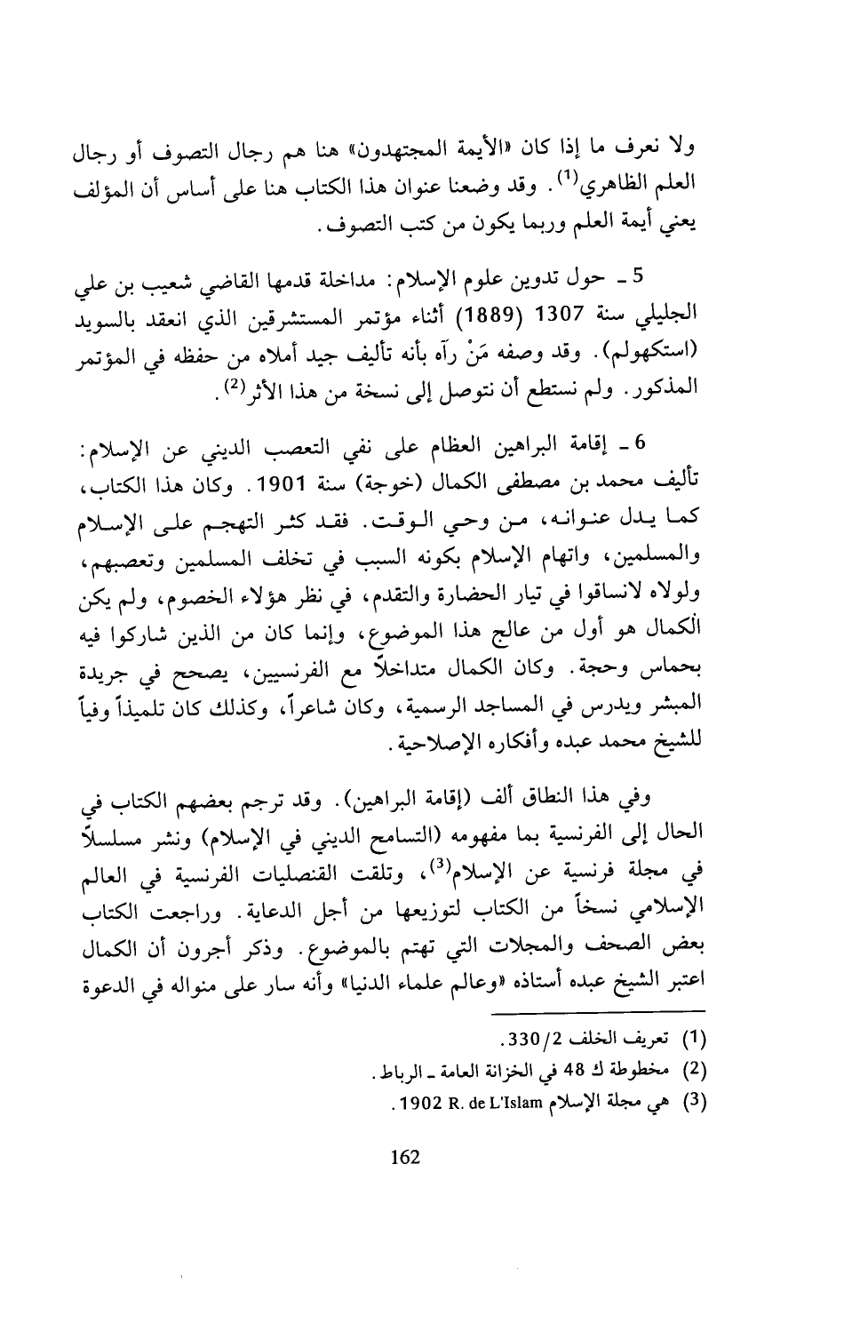 وفي هذا النطاق ألف (إقامة البراهين). وقد ترجم بعضهم الكتاب في الحال إلى الفرنسية بما مفهومه (التسامح الديني في الإسلام) ونشر مسلسلا في مجلة فرنسية عن الإسلام (¬3)، وتلقت القنصليات الفرنسية في العالم الإسلامي نسخا، من الكتاب لتوزيعها من أجل الدعاية. وراجعت الكتاب بعض الصحف والمجلات التي تهتم بالموضوع. وذكر أجرون أن الكمال اعتبر الشيخ عبده أستاذه (وعالم علماء الدنيا) وأنه سار على منواله في الدعوة