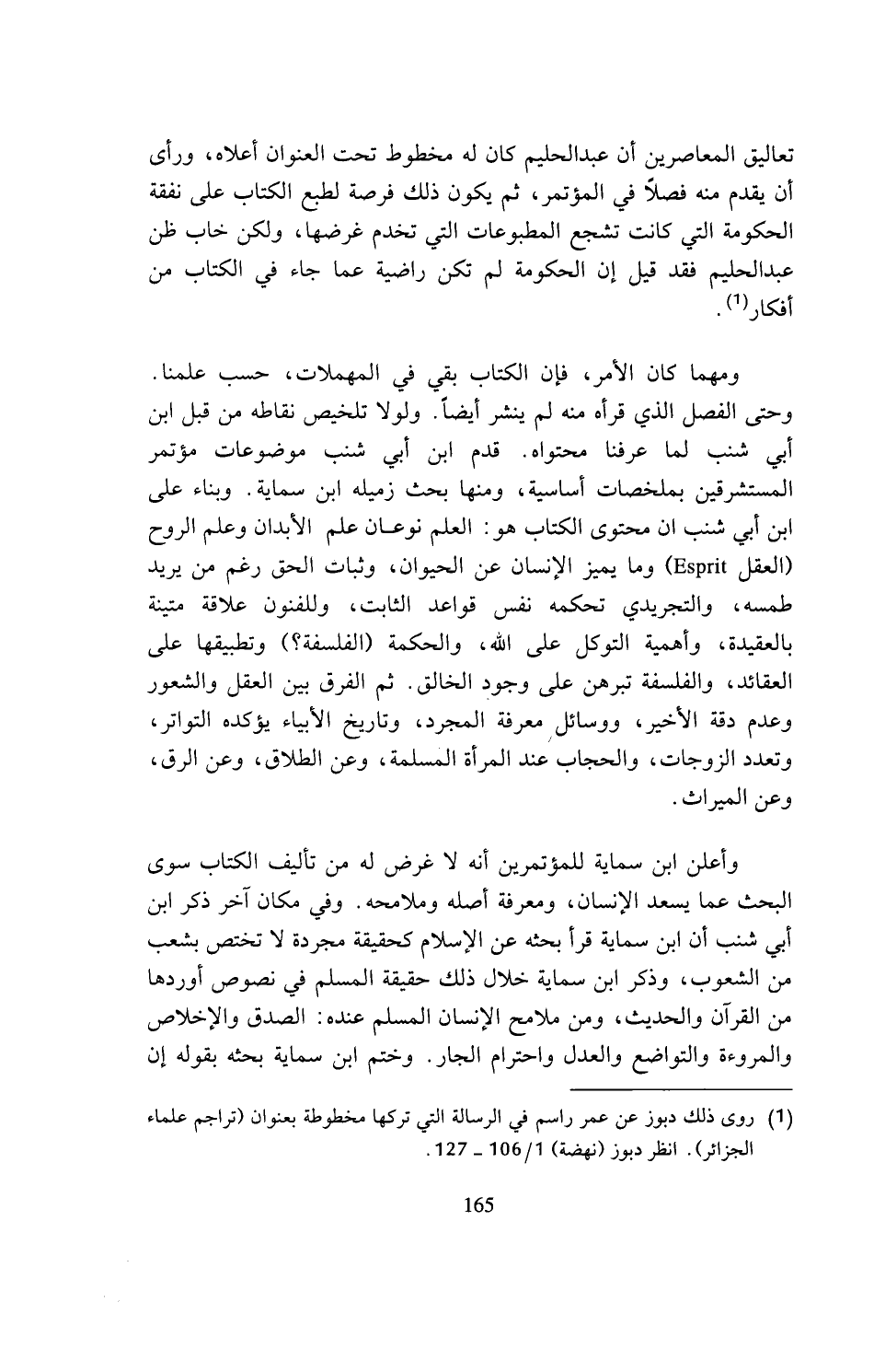 ومهما كان الأمر، فإن الكتاب بقي في المهملات، حسب علمنا. وحتى الفصل الذي قرأه منه لم ينشر أيضا. ولولا تلخيص نقاطه من قبل ابن أبي شنب لما عرفنا محتواه. قدم ابن أبي شنب موضوعات مؤتمر المستشرقين بملخصات أساسية، ومنها بحث زميله ابن سماية. وبناء على ابن أبي شنب ان محتوى الكتاب هو: العلم نوعان علم الأبدان وعلم الروح (العقل Esprit) وما يميز الإنسان عن الحيوان، وثبات الحق رغم من يريد طمسه، والتجريدي تحكمه نفس قواعد الثابت، وللفنون علاقة متينة بالعقيدة، وأهمية التوكل على الله، والحكمة (الفلسفة؟) وتطبيقها على العقائد، والفلسفة ترهن على وجود الخالق. ثم الفرق بين العقل والشعور وعدم دقة الأخير، ووسائل معرفة المجرد، وتاريخ الأنبياء يؤكده التواتر، وتعدد الزوجات، والحجاب عند المرأة المسلمة، وعن الطلاق، وعن الرق، وعن الميراث.