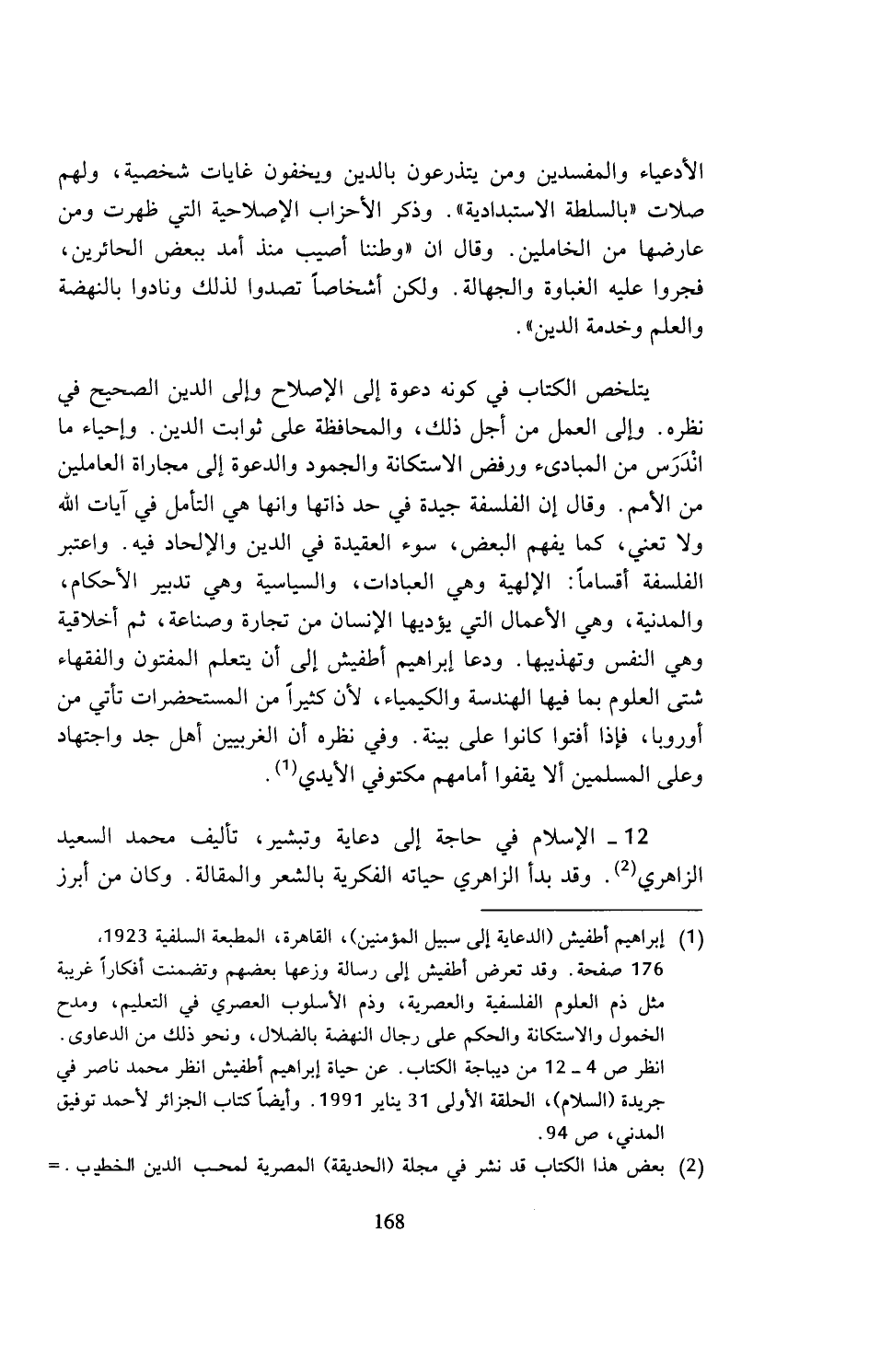 12 - الإسلام في حاجة إلى دعاية وتبشير، تأليف محمد السعيد الزاهري (¬2). وقد بدأ الزاهري حياته الفكرية بالشعر والمقالة. وكان من أبرز