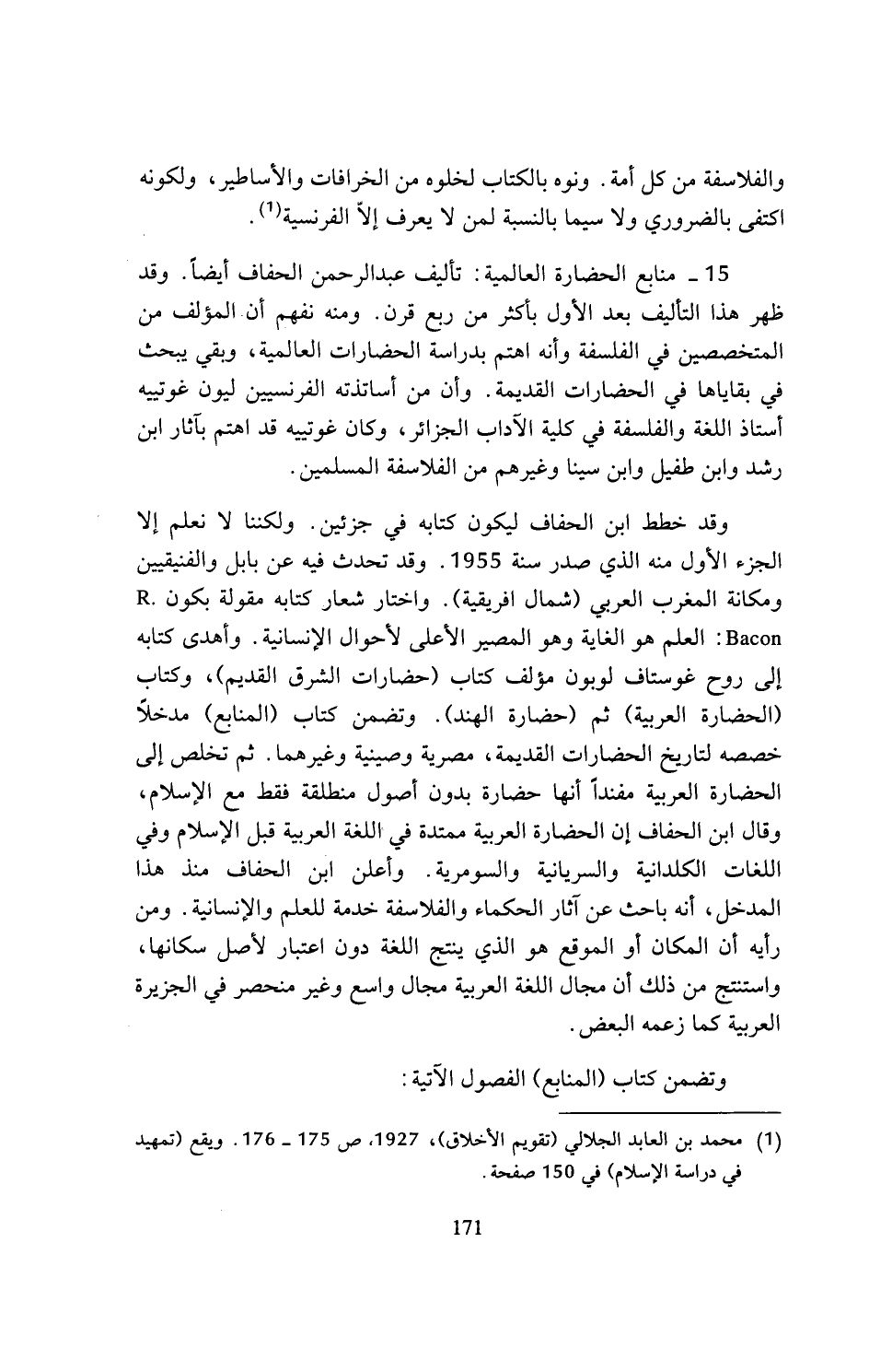 15 - منابع الحضارة العالمية: تأليف عبد الرحمن الحفاف أيضا. وقد ظهر هذا التأليف بعد الأول بأكثر من ربع قرن. ومنه نفهم أن المؤلف من المتخصصين في الفلسفة وأنه اهتم بدراسة الحضارات العالمية، وبقي يبحث في بقاياها في الحضارات القديمة. وأن من أساتذته الفرنسيين ليون غوتييه أستاذ اللغة والفلسفة في كلية الآداب الجزائر، وكان غوتييه قد اهتم بآثار ابن رشد وابن طفيل وابن سينا وغيرهم من الفلاسفة المسلمين.