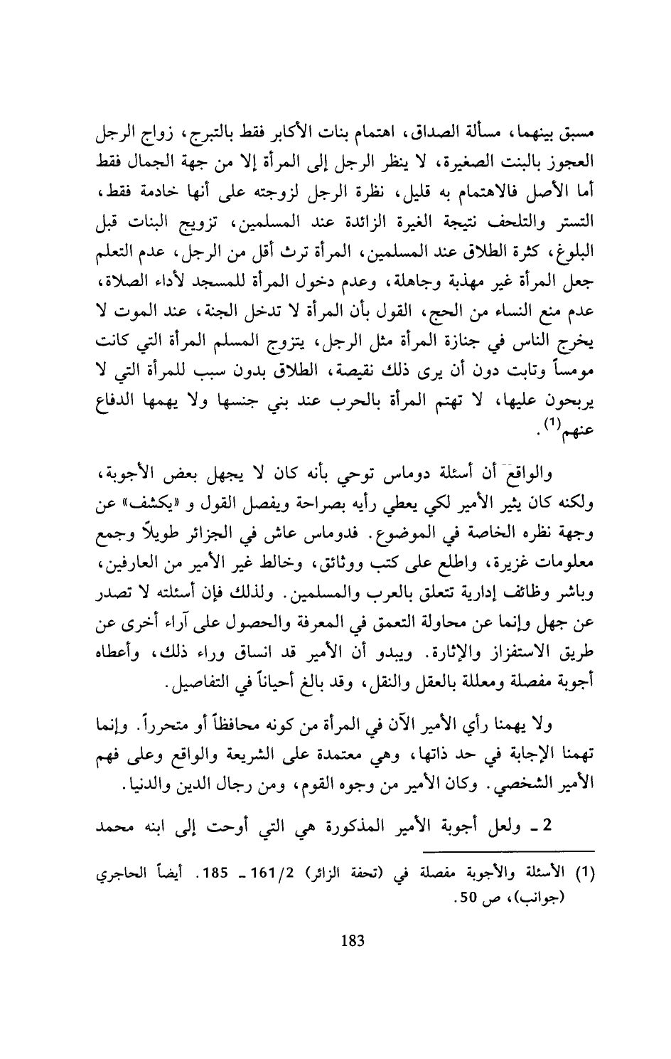 والواقع أن أسئلة دوماس توحي بأنه كان لا يجهل بعض الأجوبة، ولكنه كان يثير الأمير لكي يعطي رأيه بصراحة ويفصل القول و (يكشف) عن وجهة نظره الخاصة في الموضوع. فدوماس عاش في الجزائر طويلا وجمع معلومات غزيرة، واطلع على كتب ووثائق، وخالط غير الأمير من العارفين، وباشر وظائف إدارية تتعلق بالعرب والمسلمين. ولذلك فإن أسئلته لا تصدر عن جهل وإنما عن محاولة التعمق في المعرفة والحصول على آراء أخرى عن طريق الاستفزاز والإثارة. ويبدو أن الأمير قد انساق وراء ذلك، وأعطاه أجوبة مفصلة ومعللة بالعقل والنقل، وقد بالغ أحيانا في التفاصيل.
