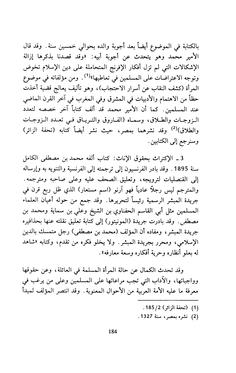 بالكتابة في الموضوع أيضا بعد أجوبة والده بحوالي خمسين سنة. وقد قال الأمير محمد وهو يتحدث عن أجوبة أبيه: (وقد قصدنا بذكرها إزالة الإشكالات التي لم تزل أفكار الإفرنج المتحاملة على دين الإسلام تخوض وتوجه الاعتراضات على المسلمين في تعاطيها) (¬1). ومن مؤلفاته في موضوع المرأة (كشف النقاب عن أسرار الاحتجاب)، وهو تأليف يعالج قضية أخذت حظا من الاهتمام والأدبيات في المشرق وفي المغرب في آخر القرن الماضي عند المسلمين. كما أن الأمير محمد قد ألف كتابا آخر خصصه لتعدد الزوجات والطلاق، وسماه (الفاروق والترياق في تعدد الزوجات والطلاق) (¬2) وقد نشرهما بمصر، حيث نشر أيضا كتابه (تحفة الزائر) وسنرجع إلى الكتابين.