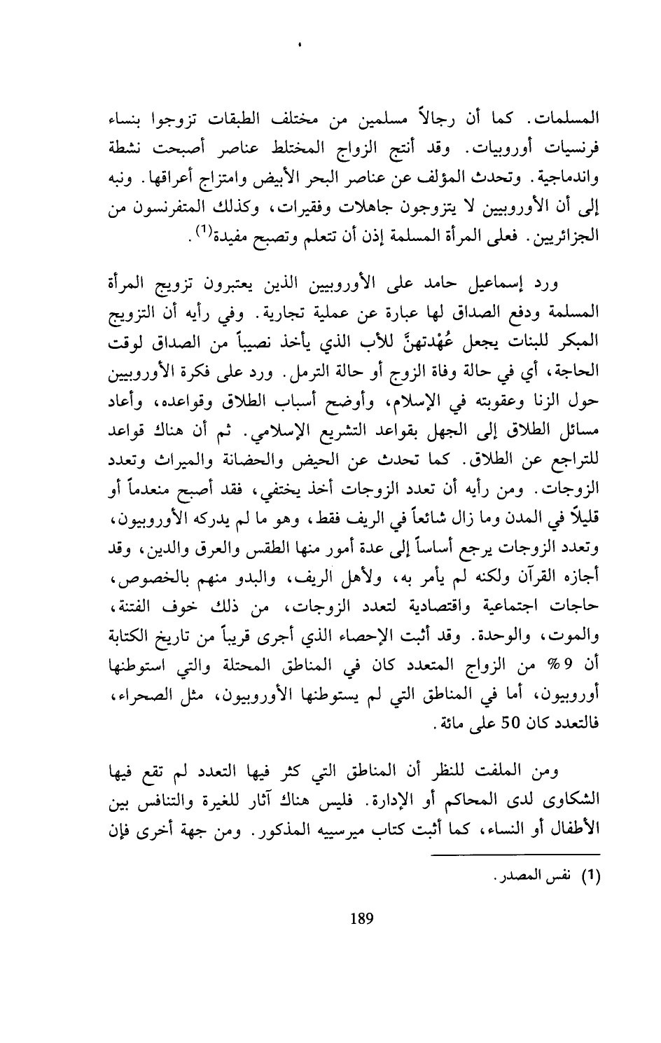 المسلمات. كما أن رجالا مسلمين من مختلف الطبقات تزوجوا بنساء فرنسيات أوروبيات. وقد أنتج الزواج المختلط عناصر أصبحت نشطة واندماجية. وتحدث المؤلف عن عناصر البحر الأبيض وامتزاج أعراقها. ونبه إلى أن الأوروبيين لا يتزوجون جاهلات وفقيرات، وكذلك المتفرنسون من الجزائريين. فعلى المرأة المسلمة إذن أن تتعلم وتصبح مفيدة (¬1).