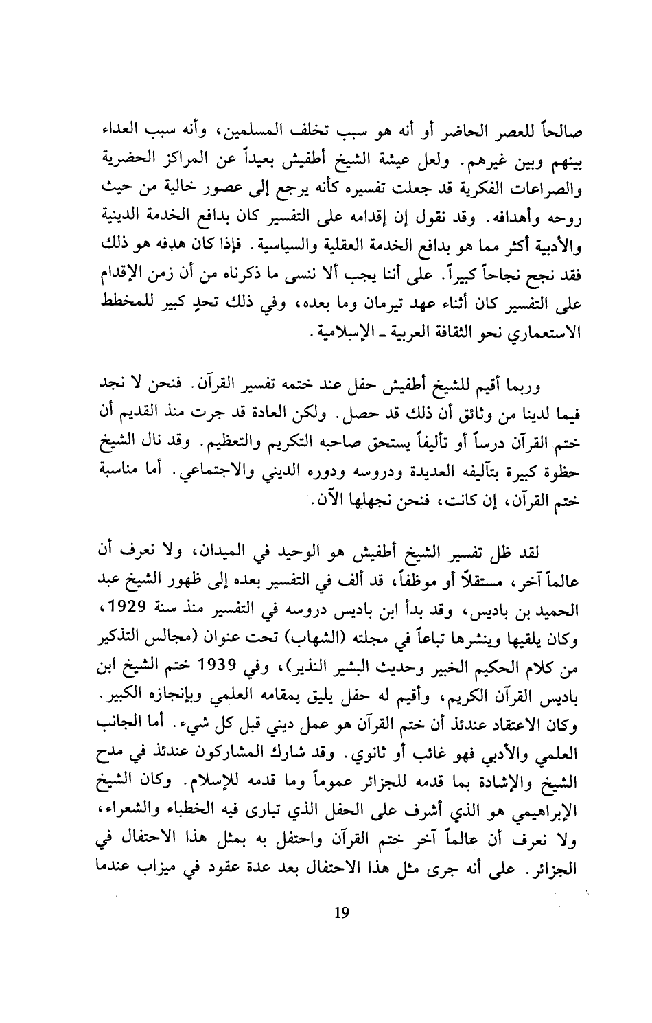 لقد ظل تفسير الشيخ أطفيش هو الوحيد في الميدان، ولا نعرف أن عالما آخر، مستقلا أو موظفا، قد ألف في التفسير بعده إلى ظهور الشيخ عبد الحميد بن باديس، وقد بدأ ابن باديس دروسه في التفسير منذ سنة 1929، وكان يلقيها وينشرها تباعا في مجلته (الشهاب) تحت عنوان (مجالس التذكير من كلام الحكيم الخبير وحديث البشير النذير)، وفي 1939 ختم الشيخ ابن باديس القرآن الكريم، وأقيم له حفل يليق بمقامه العلمي وبإنجازه الكبير. وكان الاعتقاد عندئذ أن ختم القرآن هو عمل ديني قبل كل شيء. أما الجانب العلمي والأدبي فهو غائب أو ثانوي. وقد شارك المشاركون عندئذ في مدح الشيخ والإشادة بما قدمه للجزائر عموما وما قدمه للإسلام. وكان الشيخ الإبراهيمي هو الذي أشرف على الحفل الذي تبارى فيه الخطباء والشعراء، ولا نعرف أن عالما آخر ختم القرآن واحتفل به بمثل هذا الاحتفال في الجزائر. على أنه جرى مثل هذا الاحتفال بعد عدة عقود في ميزاب عندما