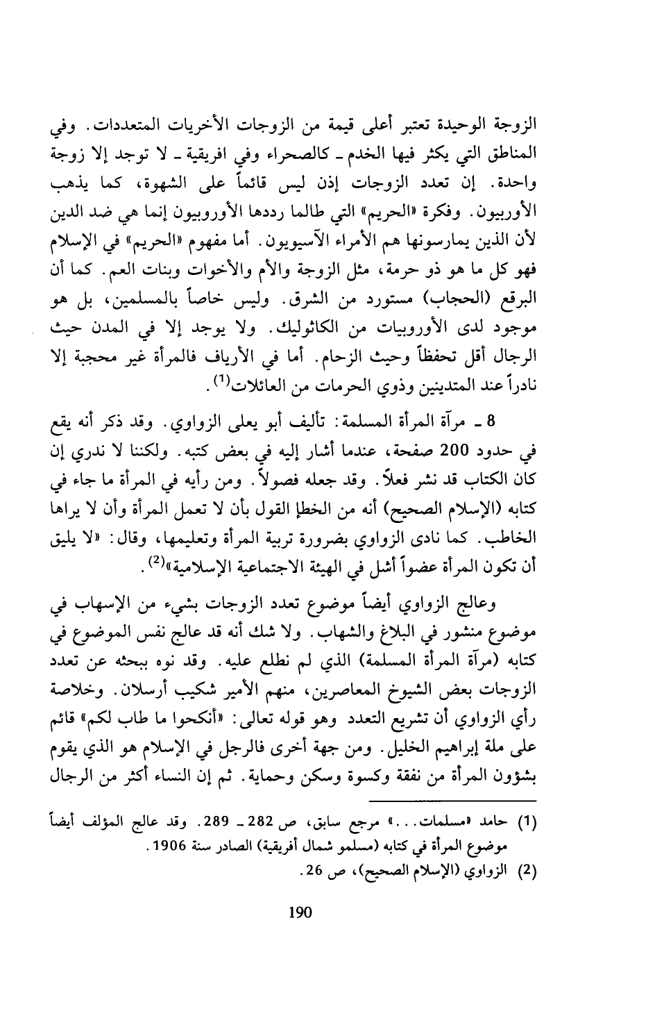 الزوجة الوحيدة تعتبر أعلى قيمة من الزوجات الأخريات المتعددات. وفي المناطق التي يكثر فيها الخدم - كالصحراء وفي افريقية - لا توجد إلا زوجة واحدة. إن تعدد الزوجات إذن ليس قائما على الشهوة، كما يذهب الأوربيون. وفكرة (الحريم) التي طالما رددها الأوروبيون إنما هي ضد الدين لأن الذين يمارسونها هم الأمراء الآسيويون. أما مفهوم (الحريم) في الإسلام فهو كل ما هو ذو حرمة، مثل الزوجة والأم والأخوات وبنات العم. كما أن البرقع (الحجاب) مستورد من الشرق. وليس خاصا بالمسلمين، بل هو موجود لدى الأوروبيات من الكاثوليك. ولا يوجد إلا في المدن حيث الرجال أقل تحفظا وحيث الزحام. أما في الأرياف فالمرأة غير محجبة إلا نادرا عند المتدينين وذوي الحرمات من العائلات (¬1).