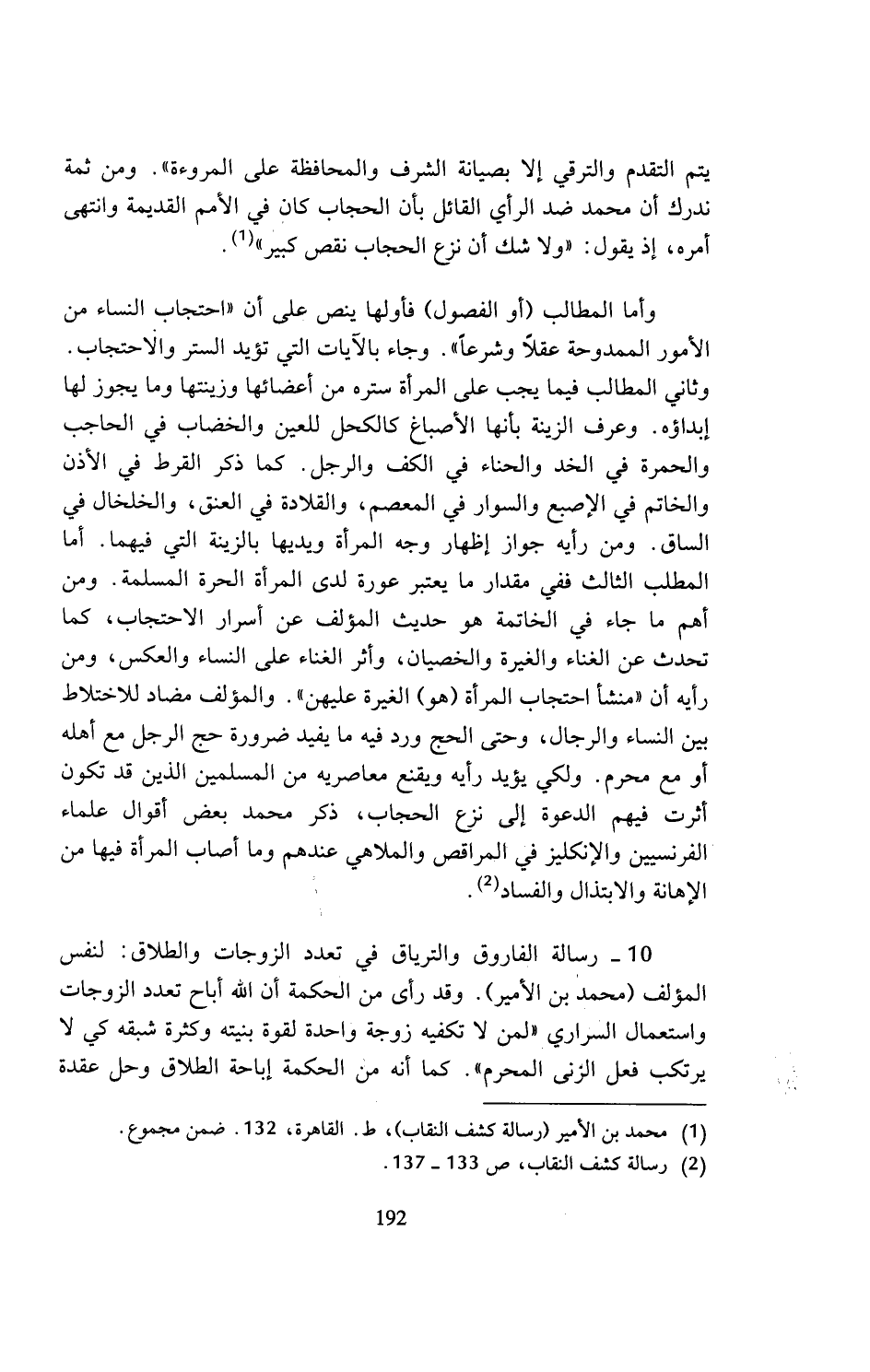 10 - رسالة الفاروق والترياق في تعدد الزوجات والطلاق: لنفس المؤلف (محمد بن الأمير). وقد رأى من الحكمة أن الله أباح تعدد الزوجات واستعمال السراري (لمن لا تكفيه زوجة واحدة لقوة بنيته وكثرة شبقه كي لا يرتكب فعل الزنى المحرم). كما أنه من الحكمة إباحة الطلاق وحل عقدة