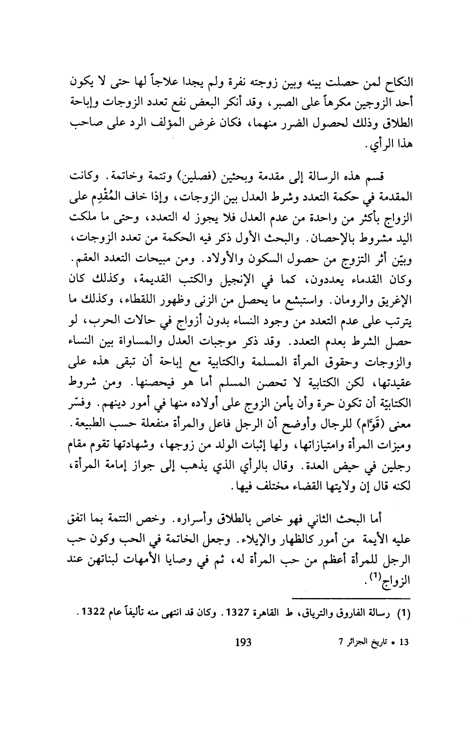قسم هذه الرسالة إلى مقدمة وبحثين (فصلين) وتتمة وخاتمة. وكانت المقدمة في حكمة التعدد وشرط العدل بين الزوجات، وإذا خاف المقدم على الزواج بأكثر من واحدة من عدم العدل فلا يجوز له التعدد، وحتى ما ملكت اليد مشروط بالإحصان. والبحث الأول ذكر فيه الحكمة من تعدد الزوجات، وبين أثر التزوج من حصول السكون والأولاد. ومن مبيحات التعدد العقم. وكان القدماء يعددون، كما في الإنجيل والكتب القديمة، وكذلك كان الإغريق والرومان. واستبشع ما يحصل من الزنى وظهور اللقطاء، وكذلك ما يترتب على عدم التعدد من وجود النساء بدون أزواج في حالات الحرب، لو حصل الشرط بعدم التعدد. وقد ذكر موجبات العدل والمساواة بين النساء والزوجات وحقوق المرأة المسلمة والكتابية مع إباحة أن تبقى هذه على عقيدتها، لكن الكتابية لا تحصن المسلم أما هو فيحصنها. ومن شروط الكتابية أن تكون حرة وأن يأمن الزوج على أولاده منها في أمور دينهم. وفسر معنى (قوام) للرجال وأوضح أن الرجل فاعل والمرأة منفعلة حسب الطبيعة. وميزات المرأة وامتيازاتها، ولها إثبات الولد من زوجها، وشهادتها تقوم مقام رجلين في حيض العدة. وقال بالرأي الذي يذهب إلى جواز إمامة المرأة، لكنه قال إن ولايتها القضاء مختلف فيها.