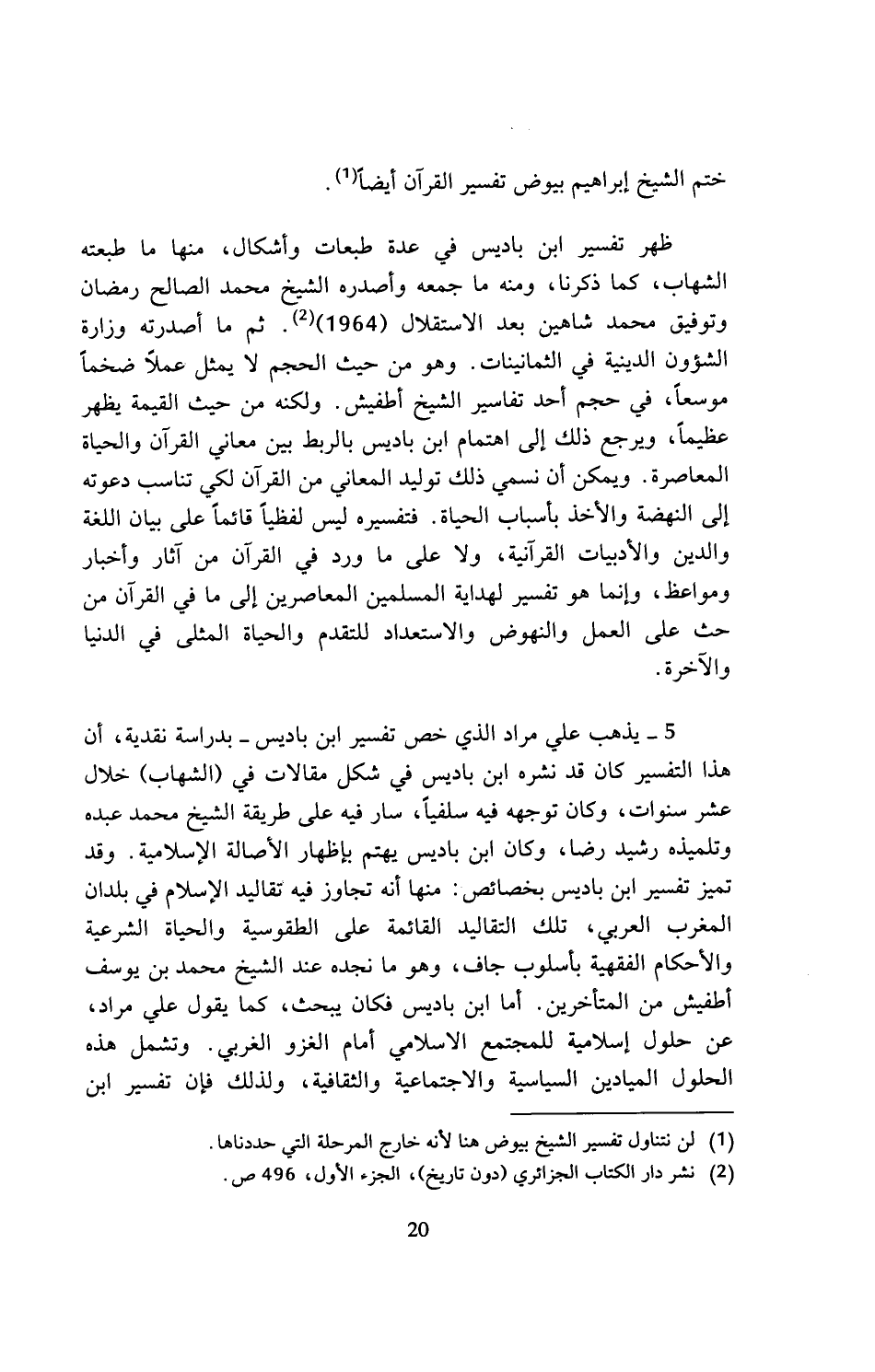 5 - يذهب علي مراد الذي خص تفسير ابن باديس - بدراسة نقدية، أن هذا التفسير كان قد نشره ابن باديس في شكل مقالات في (الشهاب) خلال عشر سنوات، وكان توجهه فيه سلفيا، سار فيه على طريقة الشيخ محمد عبده وتلميذه رشيد رضا، وكان ابن باديس يهتم بإظهار الأصالة الإسلامية. وقد تميز تفسير ابن باديس بخصائص: منها أنه تجاوز فيه تقاليد الإسلام في بلدان المغرب العربي، تلك التقاليد القائمة على الطقوسية والحياة الشرعية والأحكام الفقهية بأسلوب جاف، وهو ما نجده عند الشيخ محمد بن يوسف أطفيش من المتأخرين. أما ابن باديس فكان يبحث، كما يقول علي مراد، عن حلول إسلامية للمجتمع الاسلامي أمام الغزو الغربي. وتشمل هذه الحلول الميادين السياسية والاجتماعية والثقافية، ولذلك فإن تفسير ابن