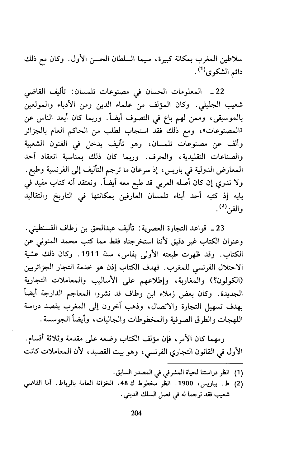 23 - قواعد التجارة العصرية: تأليف عبد الحق بن وطاف القسنطيني. وعنوان الكتاب غير دقيق لأننا استخرجناه فقط مما كتب محمد المنوني عن الكتاب. وقد ظهرت طبعته الأولى بفاس، سنة 1911. وكان ذلك عشية الاحتلال الفرنسي للمغرب. فهدف الكتاب إذن هو خدمة التجار الجزائريين (الكولون؟) والمغاربة، وإطلاعهم على الأساليب والمعاملات التجارية الجديدة. وكان بعض زملاء ابن وطاف قد نشروا المعاجم الدارجة أيضا بهدف تسهيل التجارة والاتصال، وذهب آخرون إلى المغرب بقصد دراسة اللهجات والطرق الصوفية والمخطوطات والجاليات، وأيضا الجوسسة.