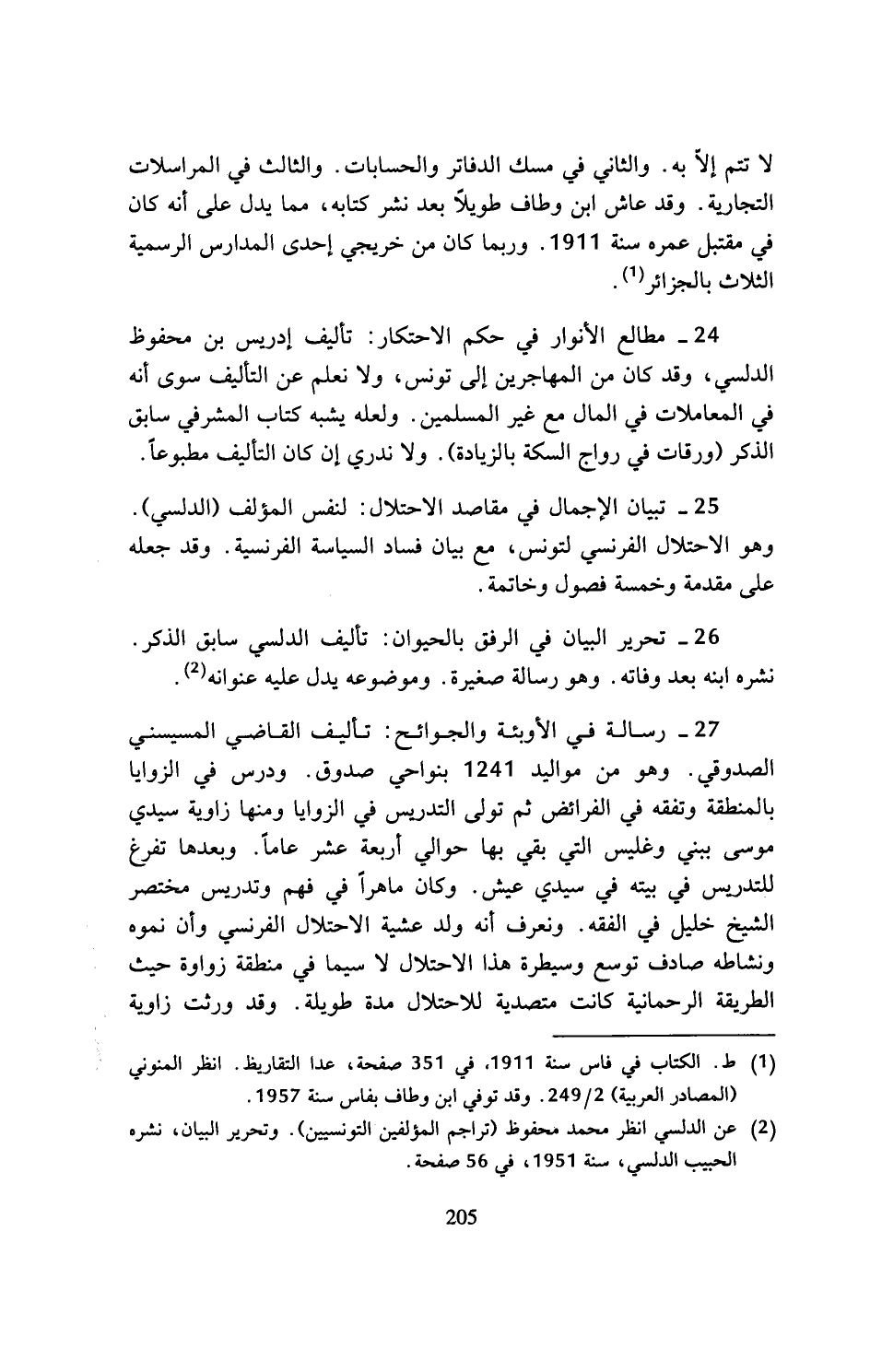 (¬2) عن الدلسي انظر محمد محفوظ (تراجم المؤلفين التونسيين). وتحرير البيان، نشره الحبيب الدلسي، سنة 1951، في 56 صفحة.