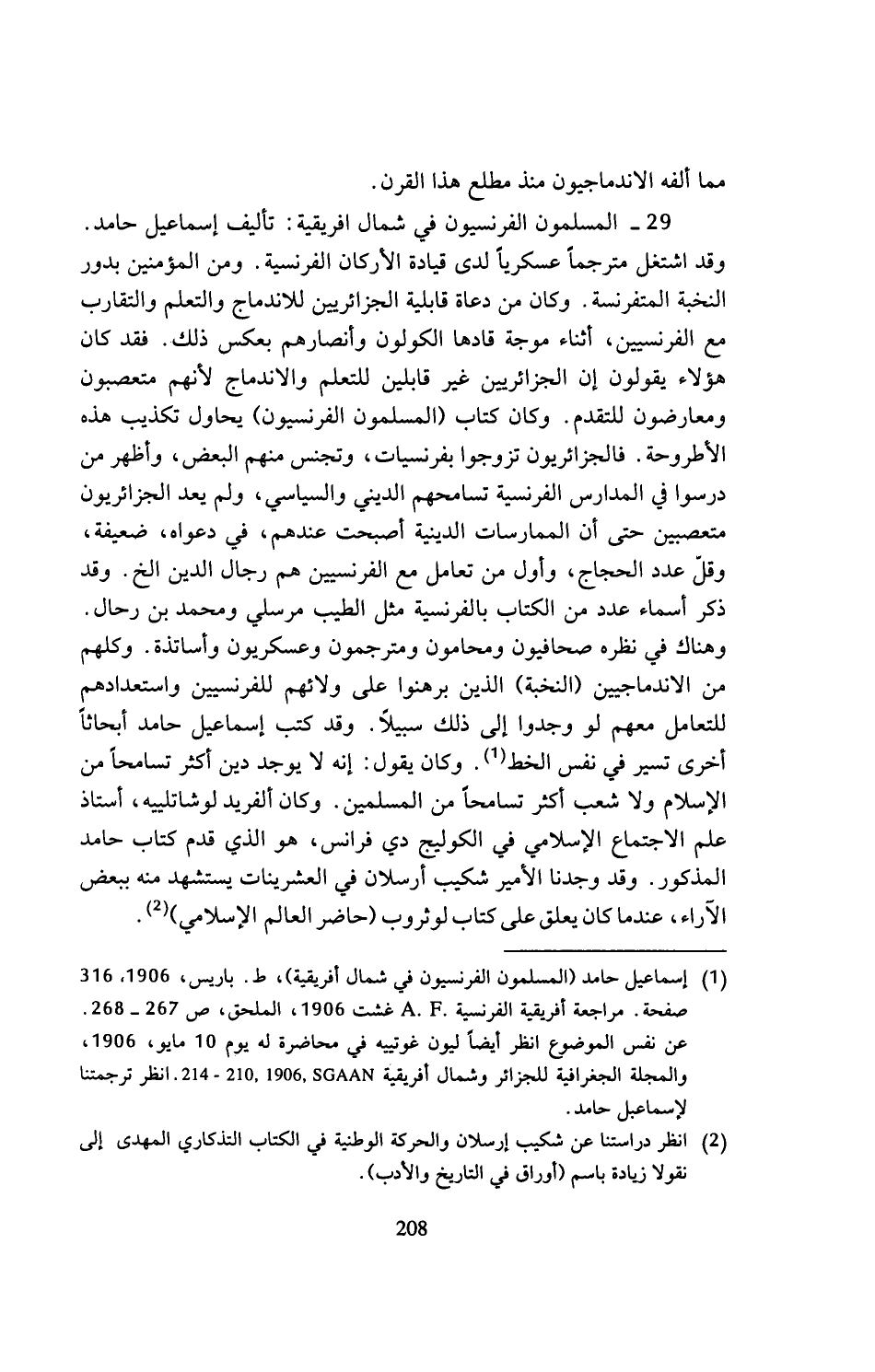 (¬1) إسماعيل حامد (المسلمون الفرنسيون في شمال افريقية)، ط. باريس، 1906، 316 صفحة. مراجعة أفريقية الفرنسية. A.F غشت 1906، الملحق، ص 267? 268. عن نفس الموضوع انظر أيضا ليون غوتييه في محاضرة له يوم 10 مايو، 1906، والمجلة الجغرافية للجزائر وشمال افريقية SGAAN,1906، 210 - 214. انظر ترجمتنا لإسماعيل حامد.