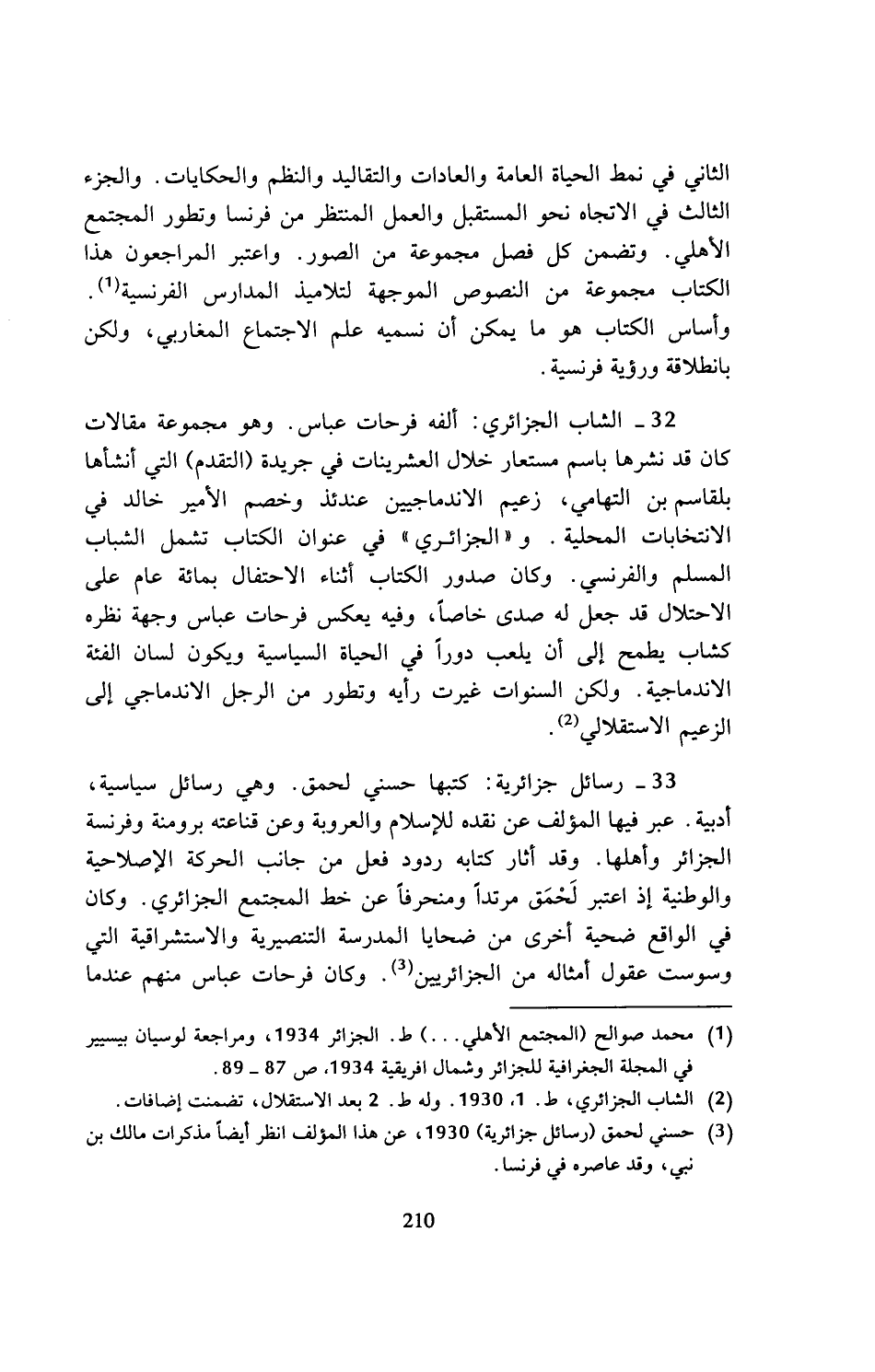 (¬3) حسني لحمق (رسائل جزائرية) 1930، عن هذا المؤلف انظر أيضا مذكرات مالك بن نبي، وقد عاصره في فرنسا.
