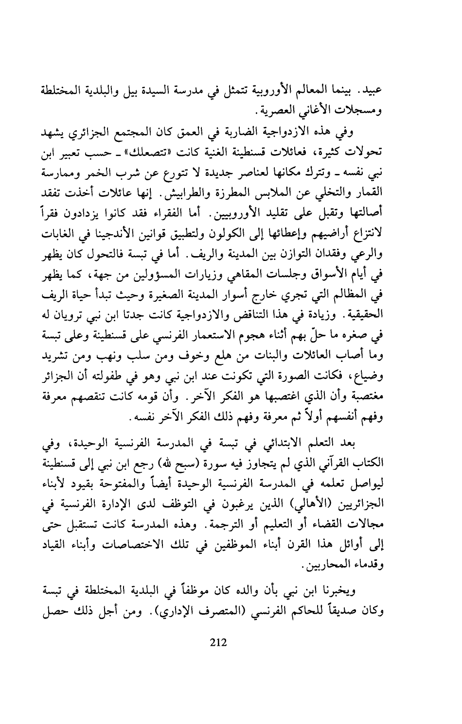وفي هذه الازدواجية الضاربة في العمق كان المجتمع الجزائري يشهد تحولات كثيرة، فعائلات قسنطينة الغنية كانت (تتصعلك) - حسب تعبير ابن نبي نفسه - وتترك مكانها لعناصر جديدة لا تتورع عن شرب الخمر وممارسة القمار والتخلي عن الملابس المطرزة والطرابيش. إنها عائلات أخذت تفقد أصالتها وتقبل على تقليد الأوروبيين. أما الفقراء فقد كانوا يزدادون فقرا لانتزاع أراضيهم وإعطائها إلى الكولون ولتطبيق قوانين الأندجينا في الغابات والرعي وفقدان التوازن بين المدينة والريف. أما في تبسة فالتحول كان يظهر في أيام الأسواق وجلسات المقاهي وزيارات المسؤولين من جهة، كما يظهر في المظالم التي تجري خارج أسوار المدينة الصغيرة وحيث تبدأ حياة الريف الحقيقية. وزيادة في هذا التناقض والازدواجية كانت جدتا امن نبي ترويان له في صغره ما حل بهم أثناء هجوم الاستعمار الفرنسي على قسنطينة وعلى تبسة وما أصاب العائلات والبنات من هلع وخوف ومن سلب ونهب ومن تشريد وضياع، فكانت الصورة التي تكونت عند ابن نبي وهو في طفولته أن الجزائر مغتصبة وأن الذي اغتصبها هو الفكر الآخر. وأن قومه كانت تنقصهم معرفة وفهم أنفسهم أولاد ثم معرفة وفهم ذلك الفكر الآخر نفسه.