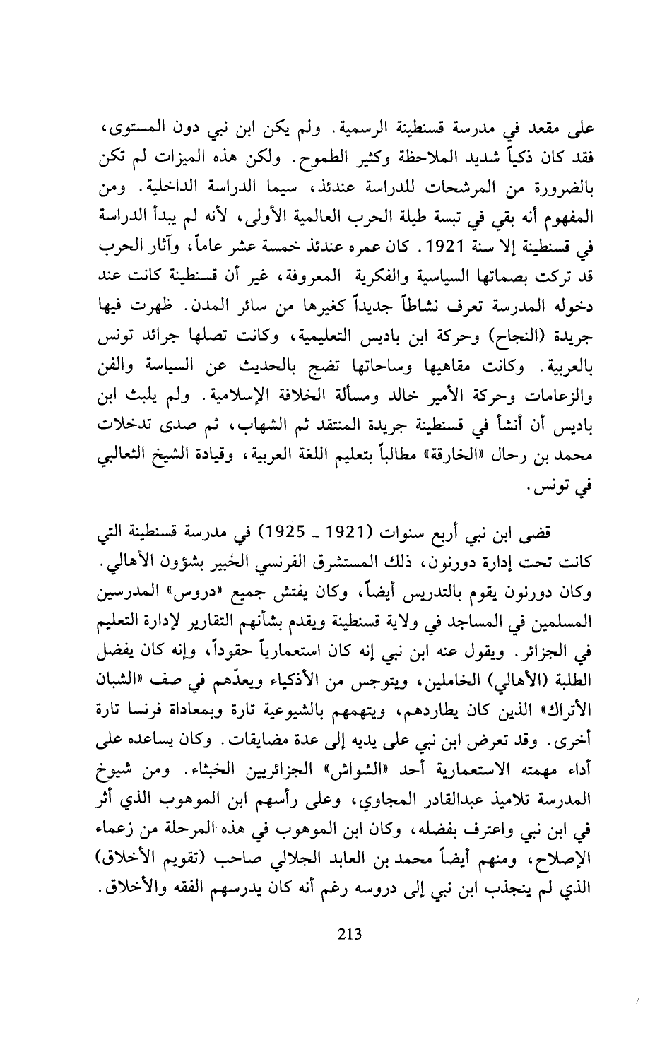 على مقعد في مدرسة قسنطينة الرسمية. ولم يكن ابن نبي دون المستوى، فقد كان ذكيا شديد الملاحظة وكثير الطموح. ولكن هذه الميزات لم تكن بالضرورة من المرشحات للدراسة عندئذ، سيما الدراسة الداخلية. ومن المفهوم أنه بقي في تبسة طيلة الحرب العالمية الأولى، لأنه لم يبدأ الدراسة في قسنطينة إلا سنة 1921. كان عمره عندئذ خمسة عشر عاما، وآثار الحرب قد تركت بصماتها السياسية والفكرية المعروفة، غير أن قسنطينة كانت عند دخوله المدرسة تعرف نشاطا جديدا كغيرها من سائر المدن. ظهرت فيها جريدة (النجاح) وحركة ابن باديس التعليمية، وكانت تصلها جرائد تونس بالعربية. وكانت مقاهيها وساحاتها تضج بالحديث عن السياسة والفن والزعامات وحركة الأمير خالد ومسألة الخلافة الإسلامية. ولم يلبث ابن باديس أن أنشأ في قسنطينة جريدة المنتقد ثم الشهاب، ثم صدى تدخلات محمد بن رحال (الخارقة) مطالبا بتعليم اللغة العربية، وقيادة الشيخ الثعالبي في تونس.
