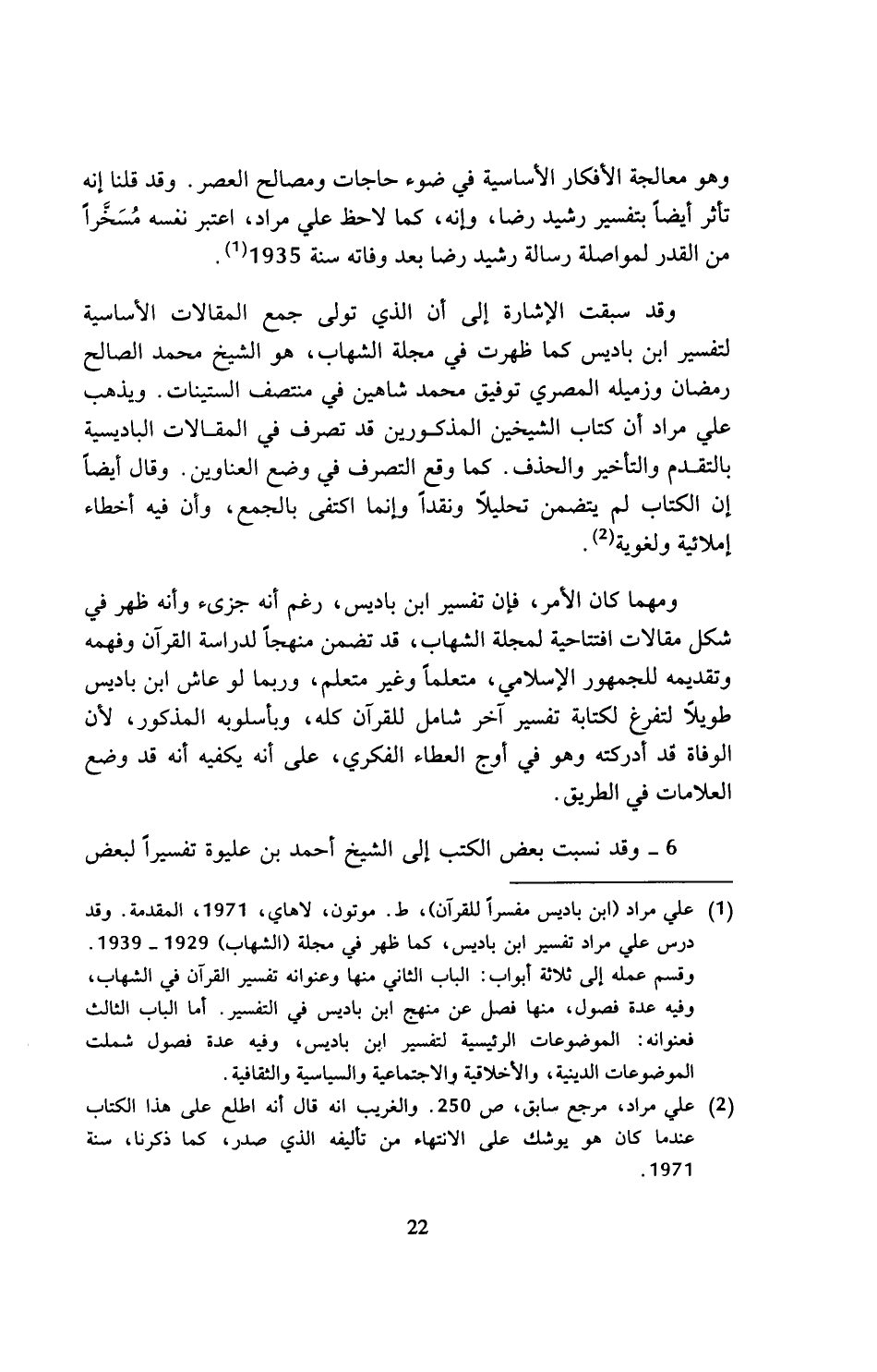 (¬1) علي مراد (ابن باديس مفسرا للقرآن)، ط. موتون، لاهاي، 1971، المقدمة. وقد درس علي مراد تفسير ابن باديس، كما ظهر في مجلة (الشهاب) 1929 - 1939. وقسم عمله إلى ثلاثة أبواب: الباب الثاني منها وعنوانه تفسير القرآن في الشهاب، وفيه عدة فصول، منها فصل عن منهج ابن باديس في التفسير. أما الباب الثالث فعنوانه: الموضوعات الرئيسية لتفسير ابن باديس، وفيه عدة فصول شملت الموضوعات الدينية، والأخلاقية والاجتماعية والسياسية والثقافية.
