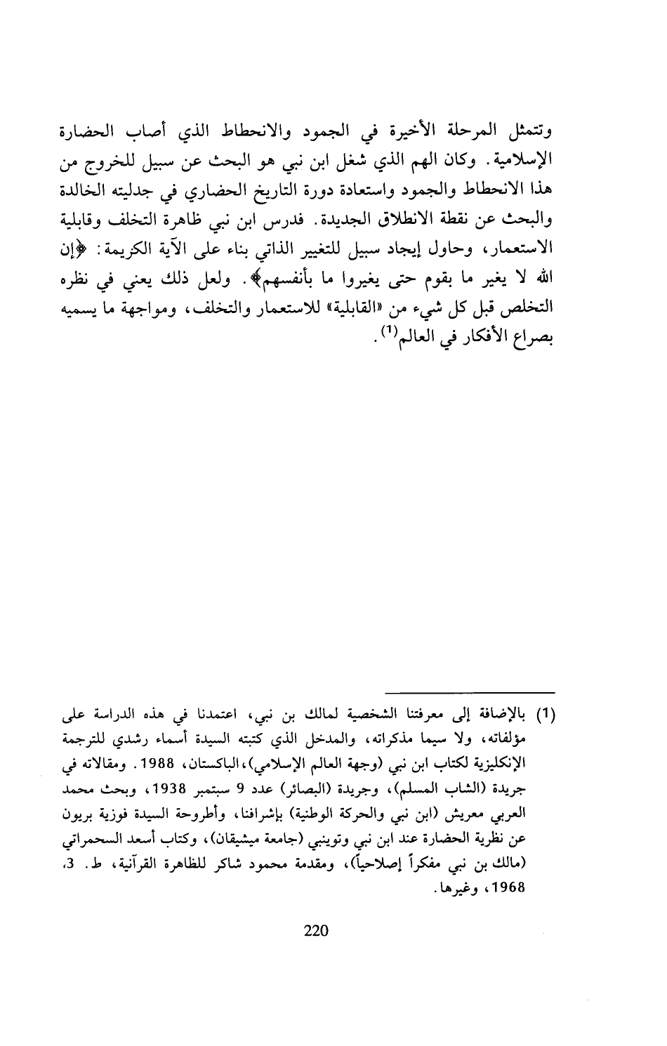 (¬1) بالإضافة إلى معرفتنا الشخصية لمالك بن نبي، اعتمدنا في هذه الدراسة على مؤلفاته، ولا سيما مذكراته، والمدخل الذي كتبته السيدة أسماء رشدي للترجمة الإنكليزية لكتاب ابن نبي (وجهة العالم الإسلامي)، الباكستان، 1988. ومقالاته في جريدة (الشاب المسلم)، وجريدة (البصائر) عدد 9 سبتمبر 1938، وبحث محمد العربي معريش (ابن نبي والحركة الوطنية) بإشرافنا، وأطروحة السيدة فوزية بريون عن نظرية الحضارة عند ابن نبي وتوينبي (جامعة ميشيقان)، وكتاب أسعد السحمراتي (مالك بن نبي مفكرا إصلاحيا)، ومقدمة محمود شاكر للظاهرة القرآنية، ط. 3، 1968، وغيرها.