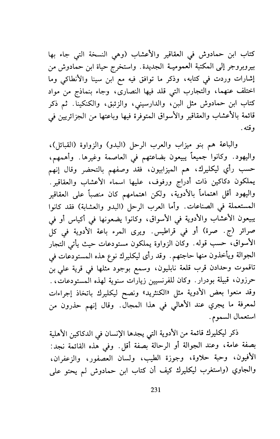 كتاب ابن حمادوش في العقاقير والأعشاب (وهي النسخة التي جاء بها بيربروجر إلى المكتبة العمومية الجديدة. واستخرج حياة ابن حمادوش من إشارات وردت في كتابه، وذكر ما توافق فيه مع ابن سينا والأنطاكي وما اختلف عنهما، والتجارب التي قلد فيها النصارى، وجاء بنماذج من مواد كتاب ابن حمادوش مثل البن، والدارسيني، والزئبق، والكنكينا. ثم ذكر قائمة بالأعشاب والعقاقير والأسواق المتوفرة فيها وباعتها من الجزائريين في وقته.
