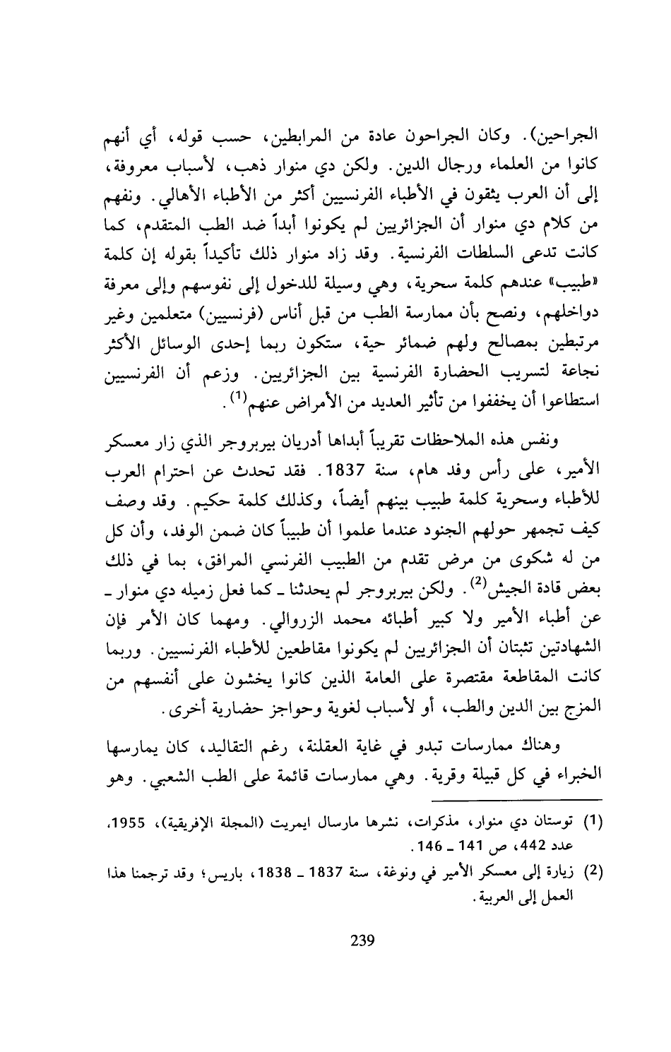 ونفس هذه الملاحظات تقريبا أبداها أدريان بيربروجر الذي زار معسكر الأمير، على رأس وفد هام، سنة 1837. فقد تحدث عن احترام العرب للأطباء وسحرية كلمة طبيب بينهم أيضا، وكذلك كلمة حكيم. وقد وصف كيف تجمهر حولهم الجنود عندما علموا أن طبيبا. كان ضمن الوفد، وأن كل من له شكوى من مرض تقدم من الطبيب الفرنسي المرافق، بما في ذلك بعض قادة الجيش (¬2). ولكن بيربروجر لم يحدثنا - كما فعل زميله دي منوار - عن أطباء الأمير ولا كبير أطبائه محمد الزروالي. ومهما كان الأمر فإن الشهادتين تثبتان أن الجزائريين لم يكونوا مقاطعين للأطباء الفرنسيين. وربما كانت المقاطعة مقتصرة على العامة الذين كانوا يخشون على أنفسهم من المزج بين الدين والطب، أو لأسباب لغوية وحواجز حضارية أخرى.