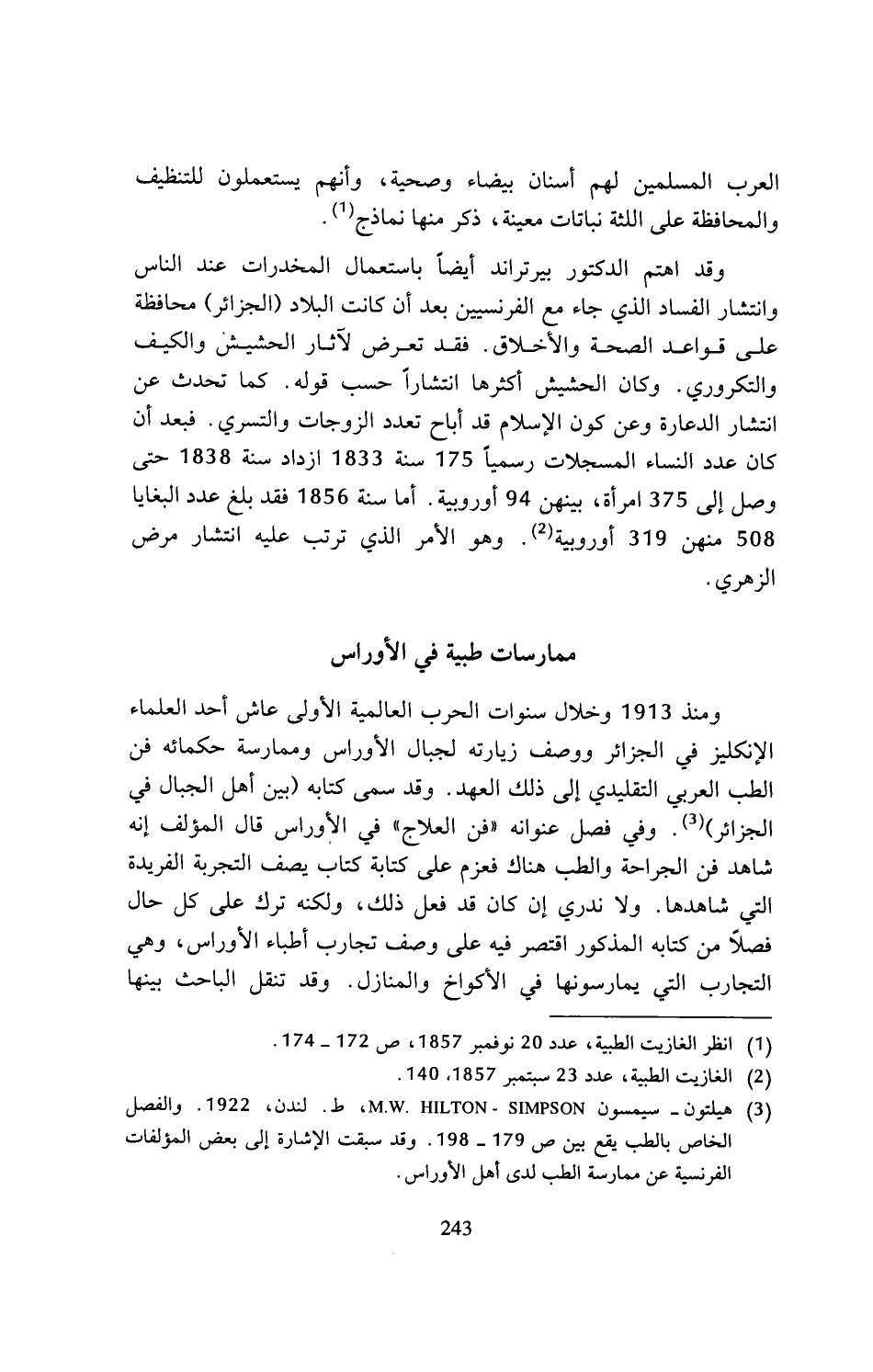 (¬3) هيلتون- سيمسون M.W. HILTON - SIMPSON، ط. لندن، 1922. والفصل الخاص بالطب يقع بين ص 179 - 198. وقد سبقت الإشارة إلى بعض المؤلفات الفرنسية عن ممارسة الطب لدى أهل الأوراس.