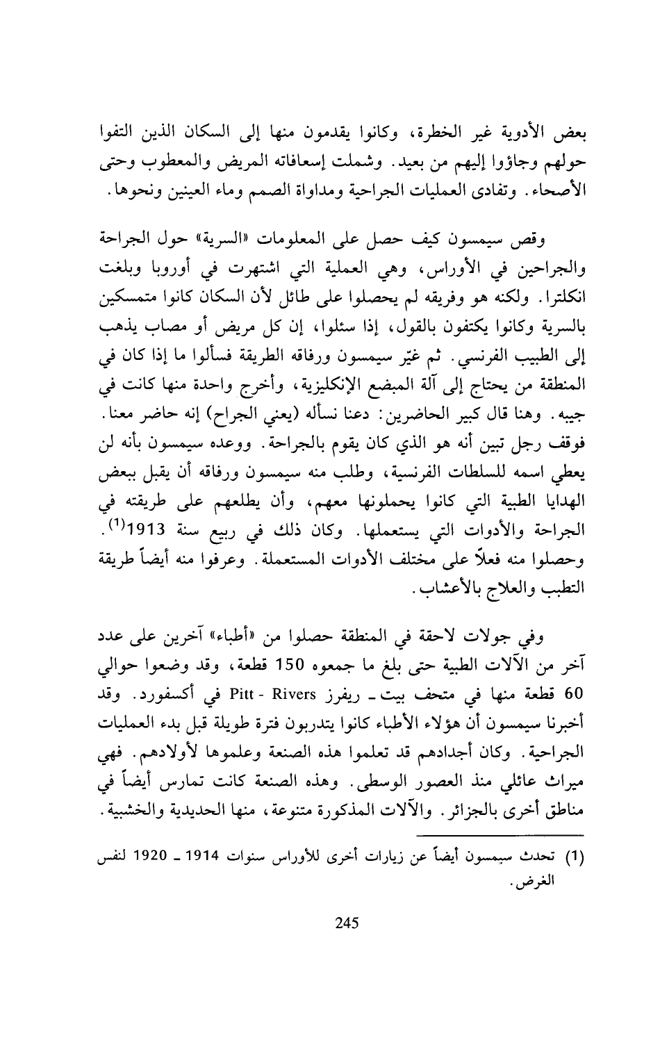 وقص سيمسون كيف حصل على المعلومات (السرية) حول الجراحة والجراحين في الأوراس، وهي العملية التي اشتهرت في أوروبا وبلغت انكلترا. ولكنه هو وفريقه لم يحصلوا على طائل لأن السكان كانوا متمسكين بالسرية وكانوا يكتفون بالقول، إذا سئلوا، إن كل مريض أو مصاب يذهب إلى الطبيب الفرنسي. ثم غير سيمسون ورفاقه الطريقة فسألوا ما إذا كان في المنطقة من يحتاج إلى آلة المبضع الإنكليزية، وأخرج واحدة منها كانت في جيبه. وهنا قال كبير الحاضرين: دعنا نسأله (يعني الجراح) إنه حاضر معنا. فوقف رجل تبين أنه هو الذي كان يقوم بالجراحة. ووعده سيمسون بأنه لن يعطي اسمه للسلطات الفرنسية، وطلب منه سيمسون ورفاقه أن يقبل ببعض الهدايا الطبية التي كازا يحملونها معهم، وأن يطلعهم على طريقته في الجراحة والأدوات التي يستعملها. وكان ذلك في ربيع سنة 1913 (¬1). وحصلوا منه فعلا على مختلف الأدوات المستعملة. وعرفوا منه أيضا طريقة التطبب والعلاج بالأعشاب.