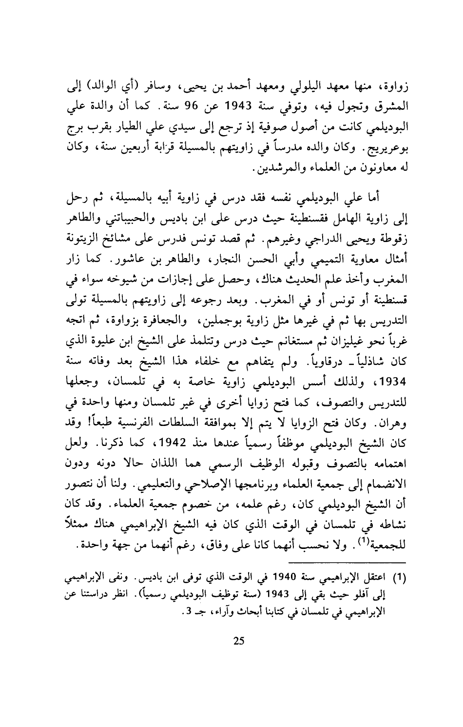 (¬1) اعتقل الإبراهيمي سنة 1940 في الوقت الذي توفى ابن باديس. ونفى الإبراهيمي إلى آفلو حيث بقي إلى 1943 (سنة توظيف البوديلمي رسميا). انظر دراستنا عن الإبراهيمي في تلمسان في كتابنا أبحاث وآراء، ج 3.