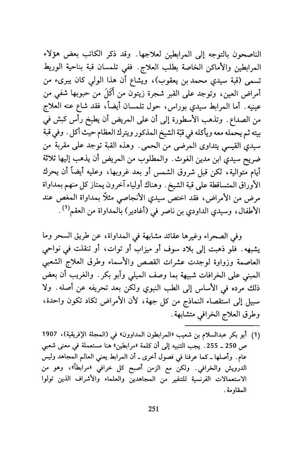(¬1) أبو بكر عبد السلام بن شعيب (المرابطون المداوون) في (المجلة الإفريقية)، 1907 ص 250? 255. يجب التنبيه إلى أن كلمة (مرابطين) هنا مستعملة في معنى شعبي عام. وأصلها - كما عرفنا في فصول أخرى - أن المرابط يعني العالم المجاهد وليس الدرويش والخرافي. ولكن مع الزمن أصبح كل خرافي (مرابطا)، وهو من الاستعمالات الفرنسية للتنفير من المجاهدين والعلماء والأشراف الذين تولوا المقاومة.
