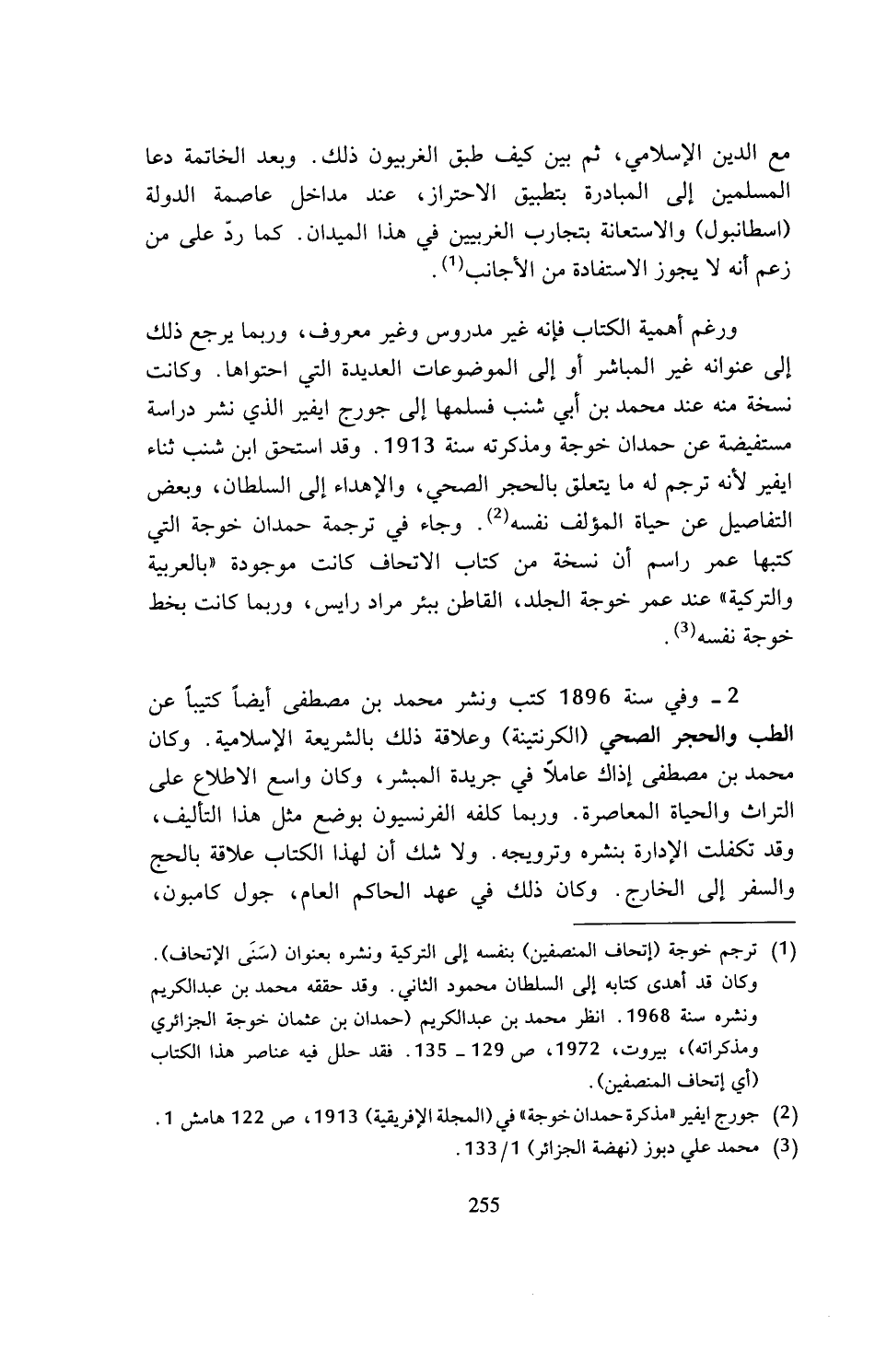 (¬1) ترجم خوجة (إتحاف المنصفين) بنفسه إلى التركية ونشره بعنوان (سنى الإتحاف). وكان قد أهدى كتابه إلى السلطان محمود الثاني. وقد حققه محمد بن عبد الكريم ونشره سنة 1968. انظر محمد بن عبد الكريم (حمدان بن عثمان خوجة الجزائري ومذكراته)، بيروت، 1972، ص 129 - 135. فقد حلل فيه عناصر هذا الكتاب (أي إتحاف المنصفين).