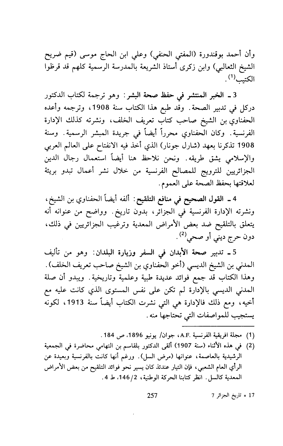 (¬2) في هذه الأثناء (سنة 1907) ألقى الدكتور بلقاسم بن التهامي محاضرة في الجمعية الرشيدية بالعاصمة، عنوانها (مرض السل). ورغم أنها كانت بالفرنسية وبعيدة عن الرأي العام الشعبي، فإن التيار عندئذ كان يسير نحو فوائد التلقيح من بعض الأمراض المعدية كالسل. انظر كتابنا الحركة الوطنية، 2/ 146، ط 4.