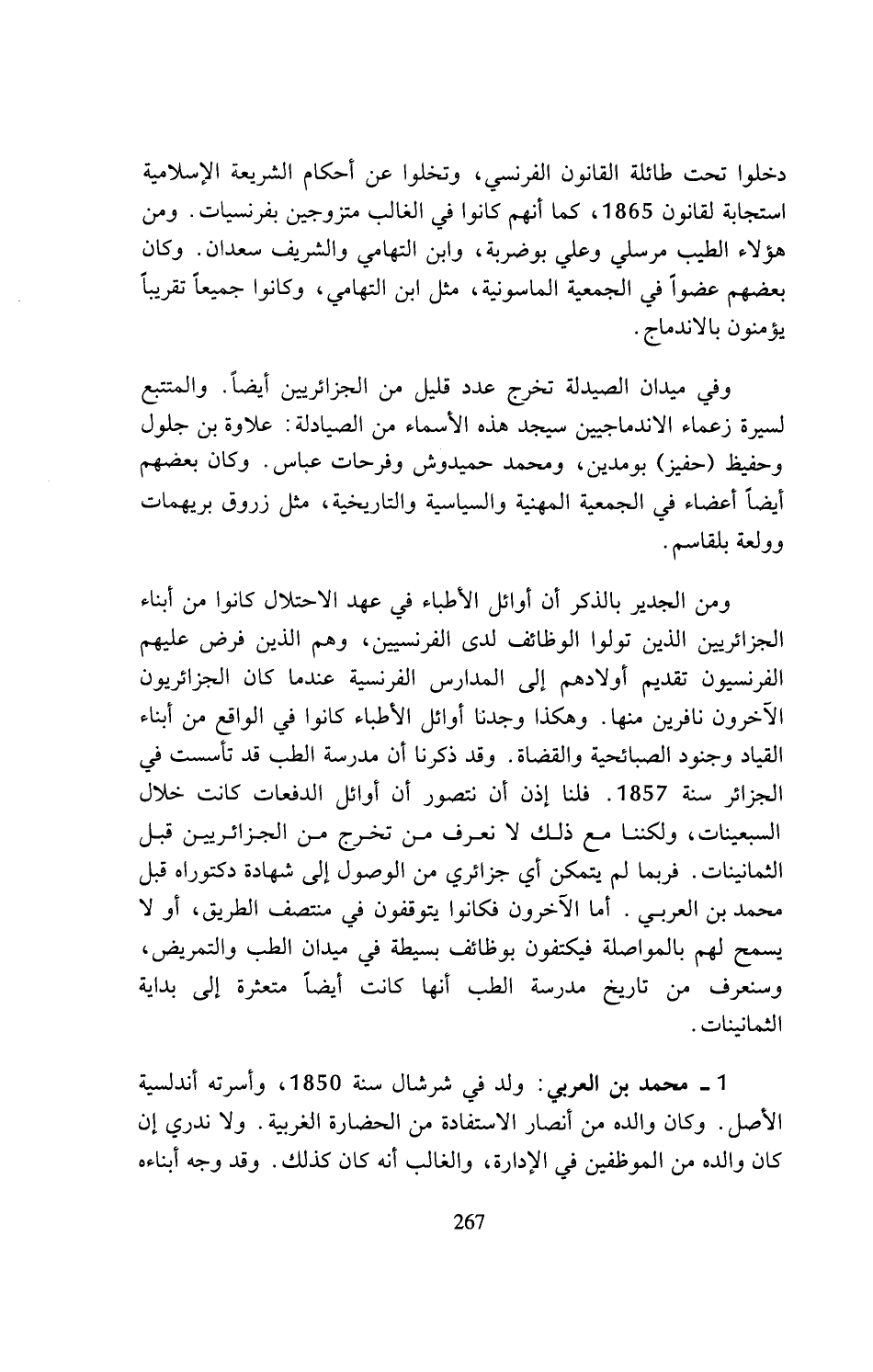 ومن الجلو بالذكر أن أوائل الأطباء في عهد الاحتلال كانوا من أبناء الجزائريين الذين تولوا الوظائف لدى الفرنسيين، وهم الذين فرض عليهم الفرنسيون تقديم أولادهم إلى المدارس الفرنسية عندما كان الجزائريون الآخرون نافرين منها. وهكذا وجدنا أوائل الأطباء كانوا في الواقع من أبناء القياد وجنود الصبائحية والقضاة. وقد ذكرنا أن مدرسة الطب قد تأسست في الجزائر سنة 1857. فلنا إذن أن نتصور أن أوائل الدفعات كانت خلال السبعينات، ولكننا مع ذلك لا نعرف من تخرج من الجزائريين قبل الثمانينات. فربما لم يتمكن أي جزائري من الوصول إلى شهادة دكتوراه قبل محمد بن العربي. أما الآخرون فكانوا يتوقفون في منتصف الطريق، أو لا يسمح لهم بالمواصلة فيكتفون بوظائف بسيطة في ميدان الطب والتمريض، وسنعرف من تاريخ مدرسة الطب أنها كانت أيضا متعثرة إلى بداية الثمانينات.
