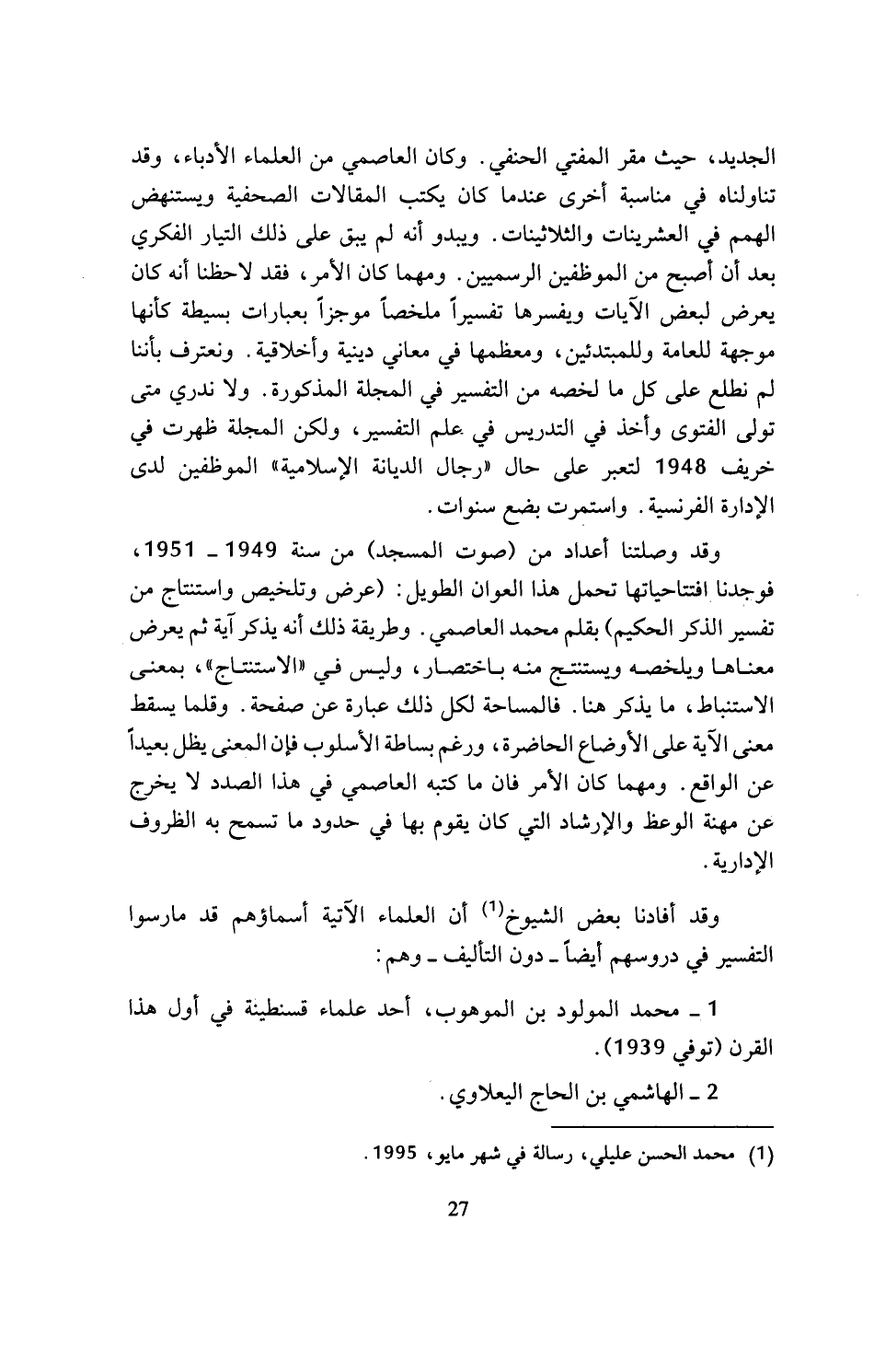 الجديد، حيث مقر المفتي الحنفي. وكان العاصمي من العلماء الأدباء، وقد تناولناه في مناسبة أخرى عندما كان يكتب المقالات الصحفية ويستنهض الهمم في العشرينات والثلاثينات. ويبدو أنه لم يبق على ذلك التيار الفكري بعد أن أصبح من الموظفين الرسميين. ومهما كان الأمر، فقد لاحظنا أنه كان يعرض لبعض الآيات ويفسرها تفسيرا ملخصا موجزا بعبارات بسيطة كأنها موجهة للعامة وللمبتدئين، ومعظمها في معاني دينية وأخلاقية. ونعترف بأننا لم نطلع على كل ما لخصه من التفسير في المجلة المذكورة. ولا ندري متى تولى الفتوى وأخذ في التدريس في علم التفسير، ولكن المجلة ظهرت في خريف 1948 لتعبر على حال (رجال الديانة الإسلامية) الموظفين لدى الإدارة الفرنسية. واستمرت بضع سنوات.