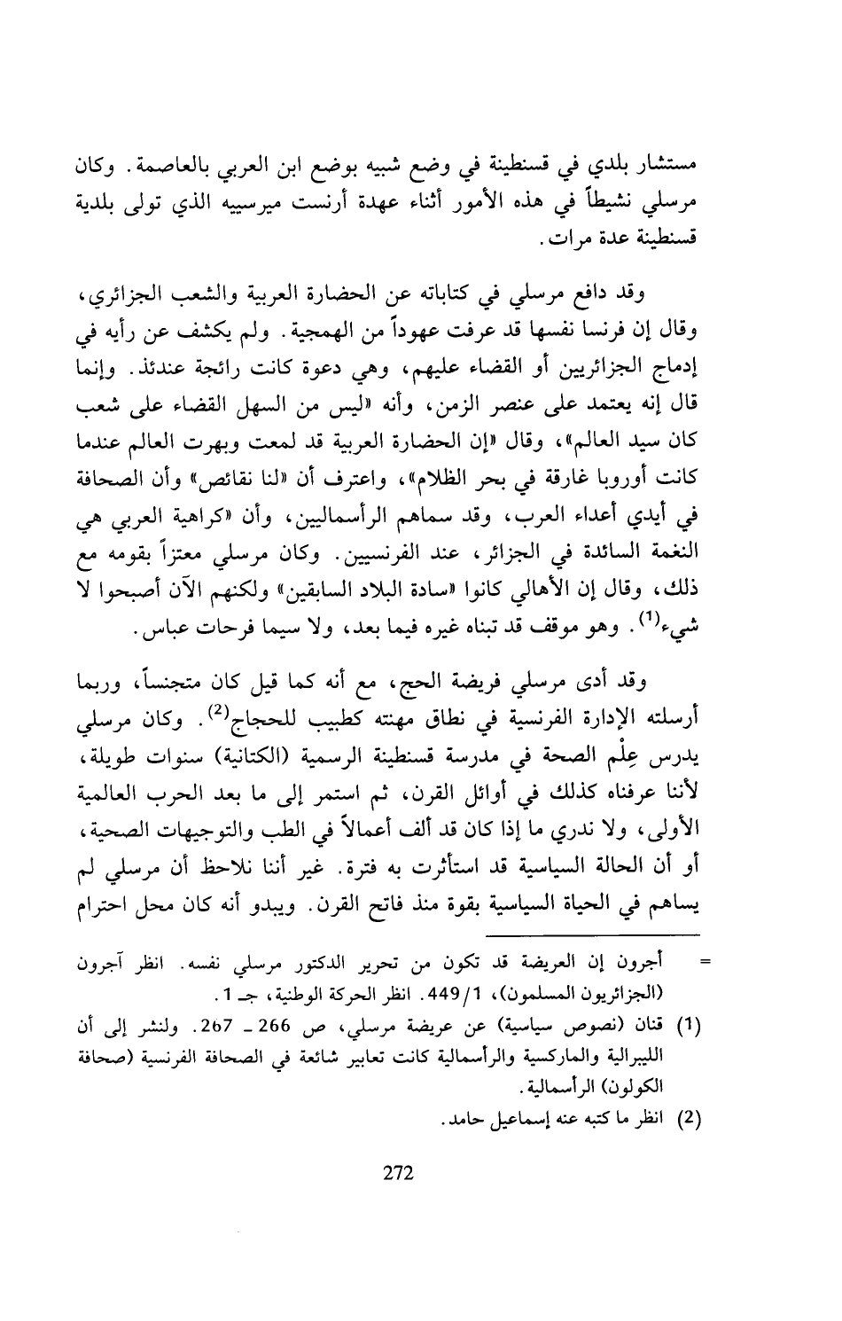 وقد أدى مرسلي فريضة الحج، مع أنه كما قيل كان متجنسا، وربما أرسلته الإدارة الفرنسية في نطاق مهنته كطبيب للحجاج (¬2). وكان مرسلي يدرس علم الصحة في مدرسة قسنطينة الرسمية (الكتانية) سنوات طويلة، لأننا عرفناه كذلك في أوائل القرن، ثم استمر إلى ما بعد الحرب العالمية الأولى، ولا ندري ما إذا كان قد ألف أعمالا في الطب والتوجيهات الصحية، أو أن الحالة السياسية قد استأثرت به فترة. غير أننا نلاحظ أن مرسلي لم يساهم في الحياة السياسية بقوة منذ فاتح القرن. ويبدو أنه كان محل احترام