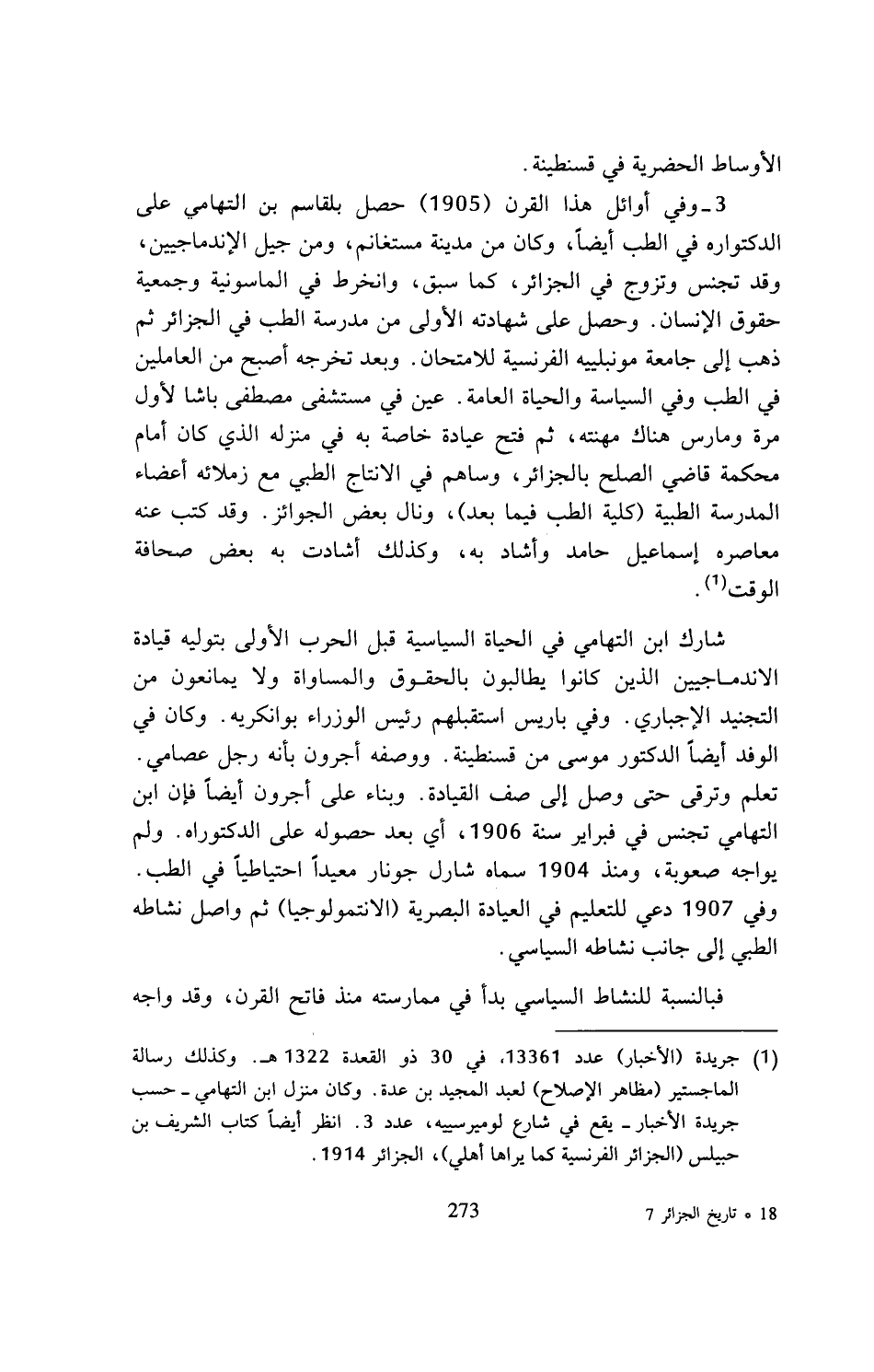 (¬1) جريدة (الأخبار) عدد 13361، في 30 ذو القعدة 1322 هـ. وكذلك رسالة الماجستير (مظاهر الإصلاح) لعبد المجيد بن عدة. وكان منزل ابن التهامي - حسب جريدة الأخبار- يقع في شارع لوميرسييه، عدد 3. انظر أيضا كتاب الشريف بن حبيلس (الجزائر الفرنسية كما يراها أهلي)، الجزائر 1914.