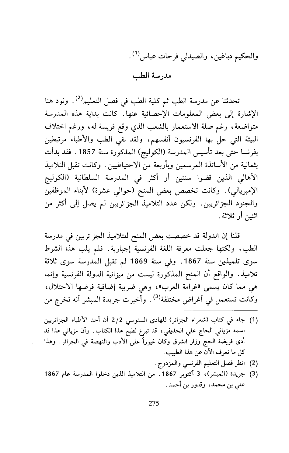 قلنا إن الدولة قد خصصت بعض المنح للتلاميذ الجزائريين في مدرسة الطب، ولكنها جعلت معرفة اللغة الفرنسية إجبارية. فلم يلب هذا الشرط سوى تلميذين سنة 1867. وفي سنة 1869 لم تقبل المدرسة سوى ثلاثة تلاميذ. والواقع أن المنح المذكورة ليست من ميزانية الدولة الفرنسية وإنما هي مما كان يسمى (غرامة العرب)، وهي ضريبة إضافية فرضها الاحلال، وكانت تستعمل في أغراض مختلفة (¬3). وأخبرت جريدة المبشر أنه تخرج من