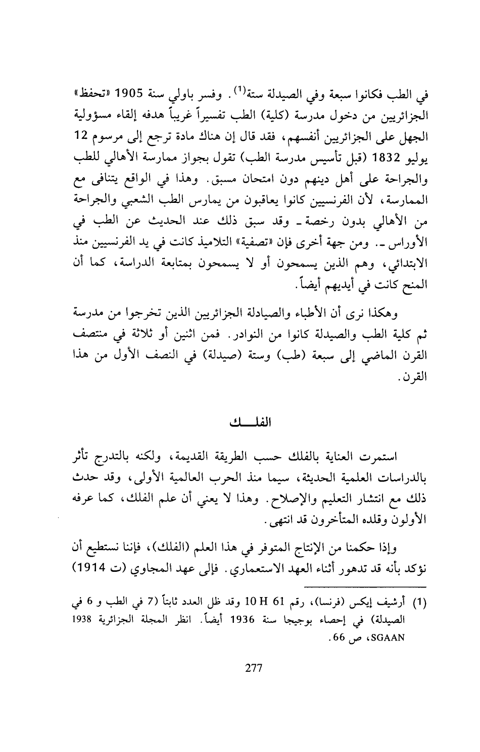 (¬1) أرشيف إيكس (فرنسا)، رقم 61 H 10 وقد ظل العدد ثابتا (7 في الطب و 6 في الصيدلة) في إحصاء بوجيجا سنة 1936 أيضا. انظر المجلة الجزائرية 1938 SGAAN، ص 66.