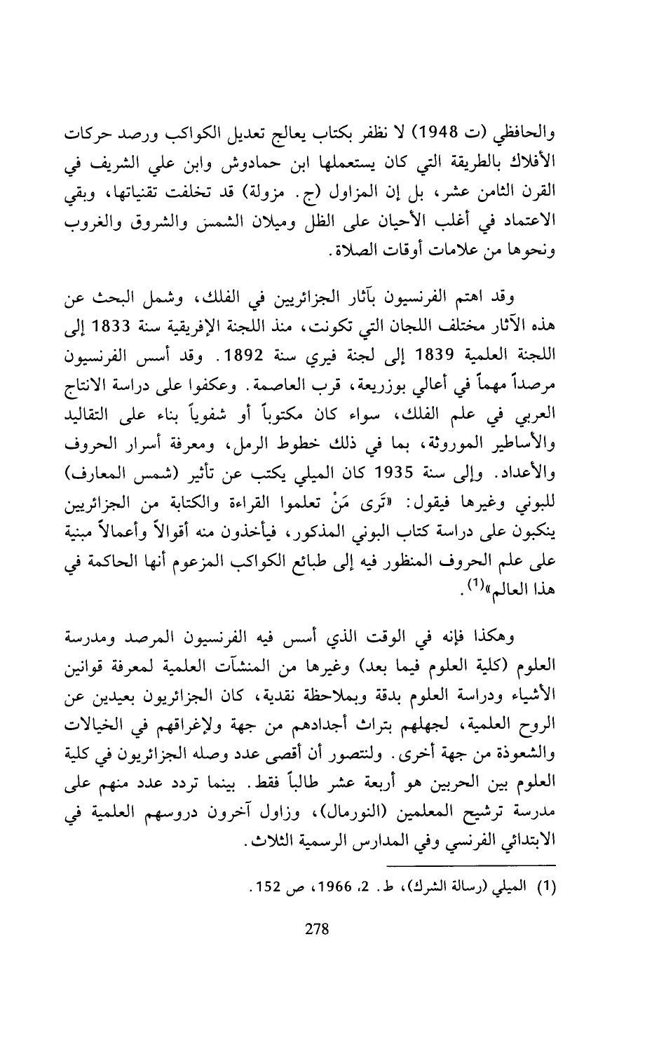 وهكذا فإنه في الوقت الذي أسس فيه الفرنسيون المرصد ومدرسة العلوم (كلية العلوم فيما بعد) وغيرها من المنشآت العلمية لمعرفة قوانين الأشياء ودراسة العلوم بدقة وبملاحظة نقدية، كان الجزائريون بعيدين عن الروح العلمية، لجهلهم بتراث أجدادهم من جهة ولإغراقهم في الخيالات والشعوذة من جهة أخرى. ولنتصور أن أقصى عدد وصله الجزائريون في كلية العلوم بين الحربين هو أربعة عشر طالبا فقط. بينما تردد عدد منهم على مدرسة ترشيح المعلمين (النورمال)، وزاول آخرون دروسهم العلمية في الابتدائي الفرنسي وفي المدارس الرسمية الثلاث.