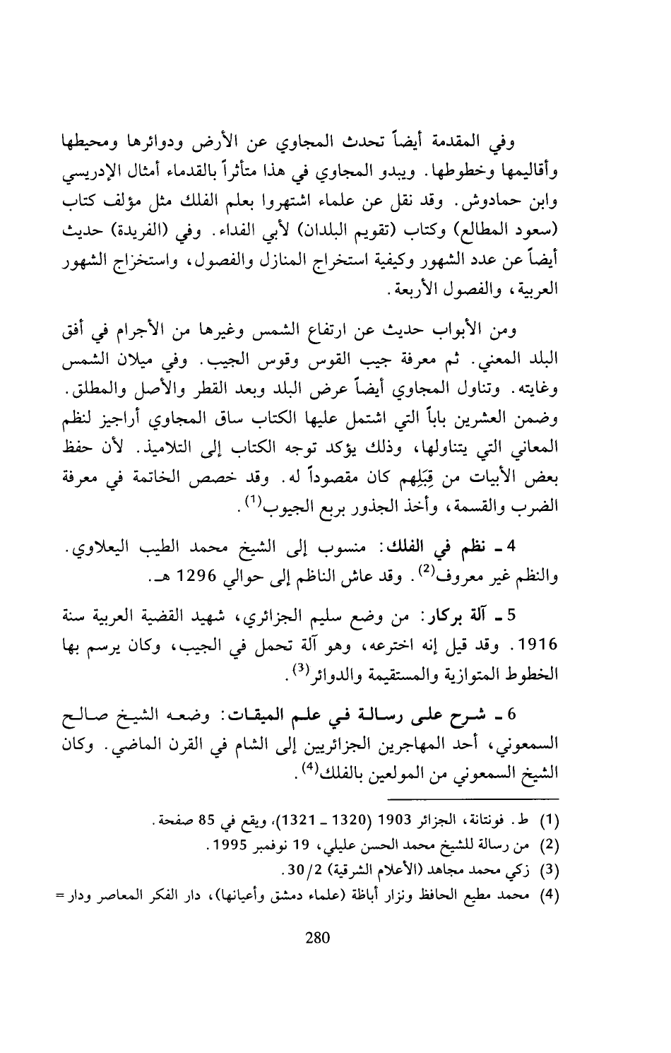 6 - شرح على رسالة في علم الميقات: وضعه الشيخ صالح السمعوني، أحد المهاجرين الجزائريين إلى الشام في القرن الماضي. وكان الشيخ السمعوني من المولعين بالفلك (¬4).
