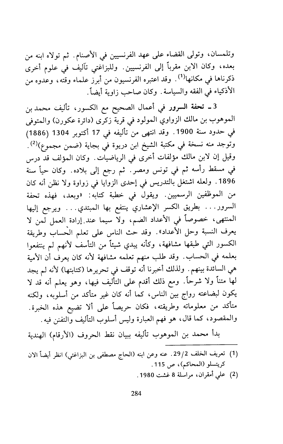 3 - تحفة السرور في أعمال الصحيح مع الكسور، تأليف محمد بن الموهوب بن مالك الزواوي المولود في قرية زكرى (دائرة عكورن) والمتوفى في حدود سنة 1900. وقد انتهى من تأليفه في 17 أكتوبر 1304 (1886) وتوجد منه نسخة في مكتبة الشيخ ابن دريوة في بجاية (ضمن مجموع) (¬2). وقيل إن لابن مالك مؤلفات أخرى في الرياضيات. وكان المؤلف قد درس في مسقط رأسه ثم في تونس ومصر. ثم رجع إلى بلاده. وكان حيا سنة 1896. ولعله اشتغل بالتدريس في إحدى الزوايا في زواوة ولا نظن أنه كان من الموظفين الرسميين. ويقول في خطبة كتابه: (وبعد، فهذه تحفة السرور ... بطريق الكسر الإعشاري ينتفع بها المبتدي ... ويرجع إليها المنتهى، خصوصا في الأعداد الضم، ولا سيما عند إرادة العمل لمن لا يعرف النسبة وحل الأعداد). وقد حث الناس على تعلم الحساب وطريقة الكسور التي طبقها مشافهة، وكأنه يبدي شيئا من التأسف لأنهم لم ينتفعوا بعلمه في الحساب. وقد طلب منهم تعلمه مشافهة لأنه كان يعرف أن الأمية هي السائدة بينهم. ولذلك أخبرنا أنه توقف في تحريرها (كتابتها) لأنه لم يجد لها متنا ولا شرحا. ومع ذلك أقدم على التأليف فيها، وهو يعلم أنه قد لا يكون لبضاعته رواج بين الناس، كما أنه كان غير متأكد من أسلوبه، ولكنه متأكد من معلوماته وطريقته، فكان حريصا على ألا تضيع هذه الخبرة. والمقصود، كما قال، هو فهم العبارة وليس أسلوب التأليف والتفنن فيه.