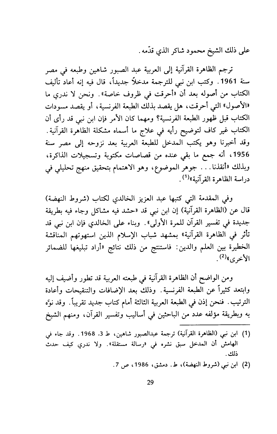 (¬1) ابن نبي (الظاهرة القرآنية) ترجمة عبد الصبور شاهين، ط 3، 1968. وقد جاء في الهامش أن المدخل سبق نشره في (رسالة مستقلة). ولا ندري كيف حدث ذلك.