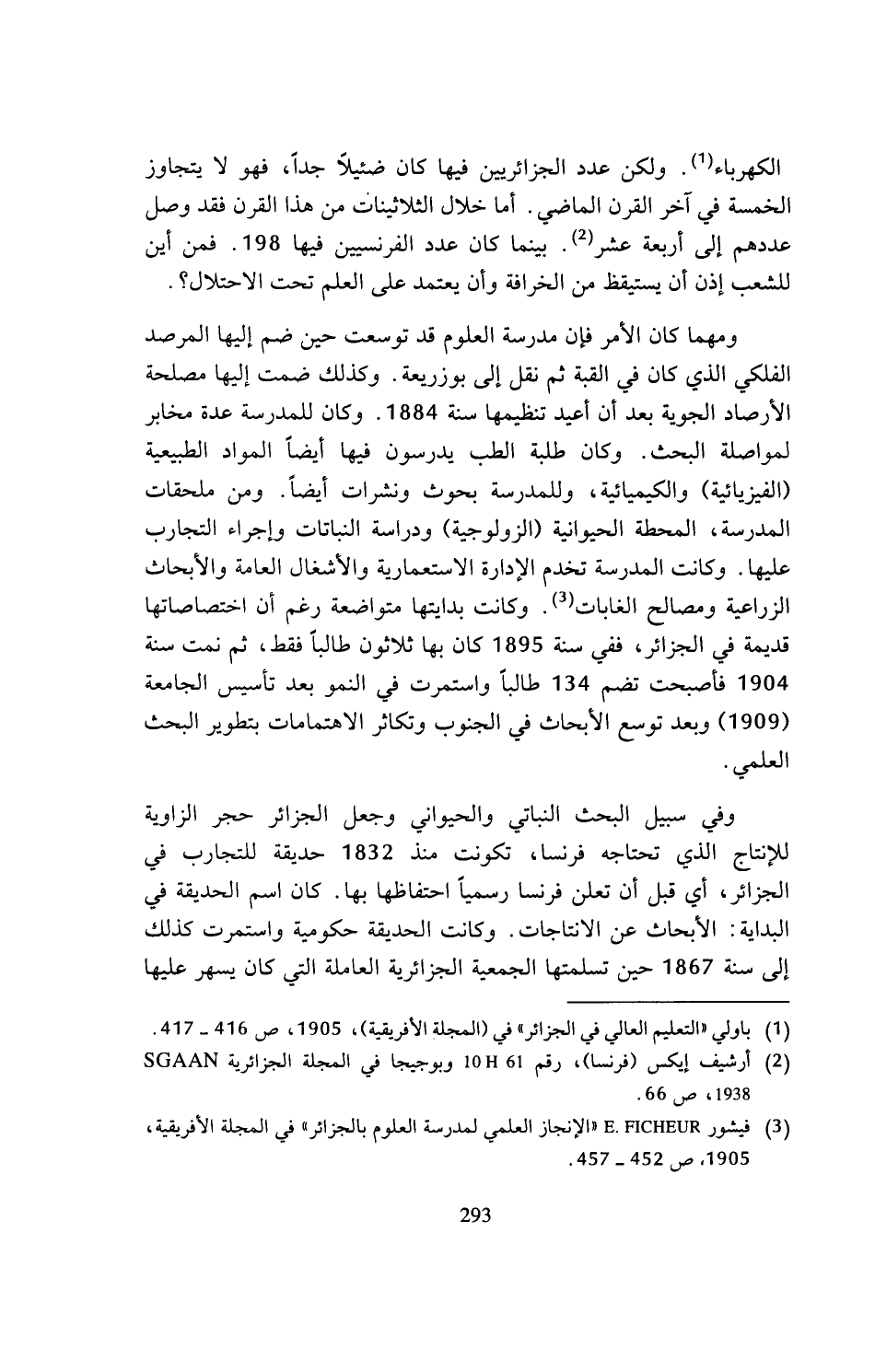 (¬3) فيشور E. FICHEUR (الإنجاز العلمي لمدرسة العلوم بالجزائر) في المجلة الأفريقية، 1905، ص 452 - 457.