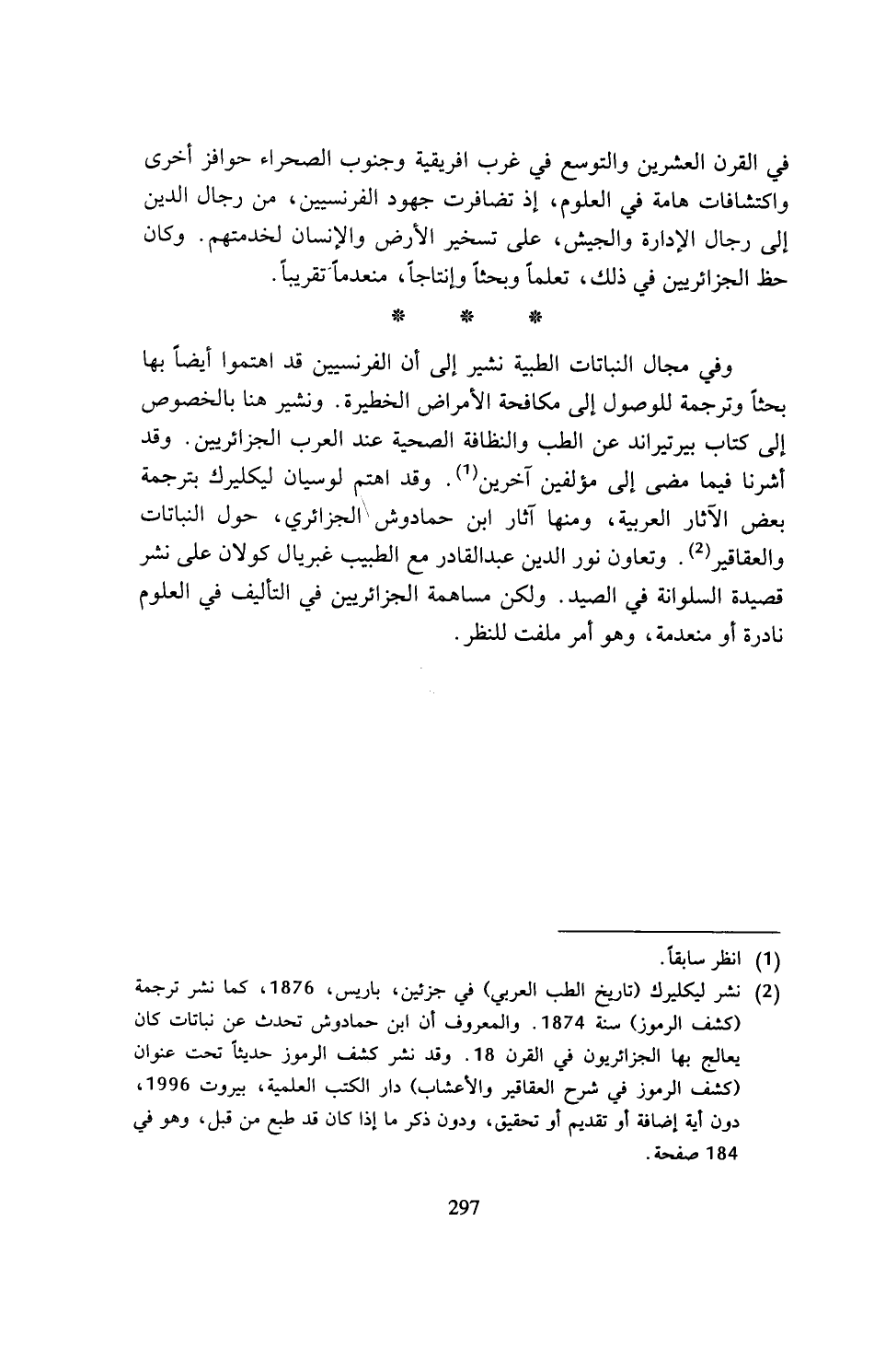 وفي مجال النباتات الطبية نشير إلى أن الفرنسيين قد اهتموا أيضا بها بحثا، وترجمة للوصول إلى مكافحة الأمراض الخطيرة. ونشير هنا بالخصوص إلى كتاب بيرتيراند عن الطب والنظافة الصحية عند العرب الجزائريين. وقد أشرنا فيما مضى إلى مؤلفين آخرين (¬1). وقد اهتم لوسيان ليكليرك بترجمة بعض الآثار العربية، ومنها آثار ابن حمادوش الجزائري، حول النباتات والعقاقير (¬2). وتعاون نور الدين عبد القادر مع الطبيب غبريال كولان على نشر قصيدة السلوانة في الصيد. ولكن مساهمة الجزائريين في التأليف في العلوم نادرة أو منعدمة، وهو أمر ملفت للنظر.