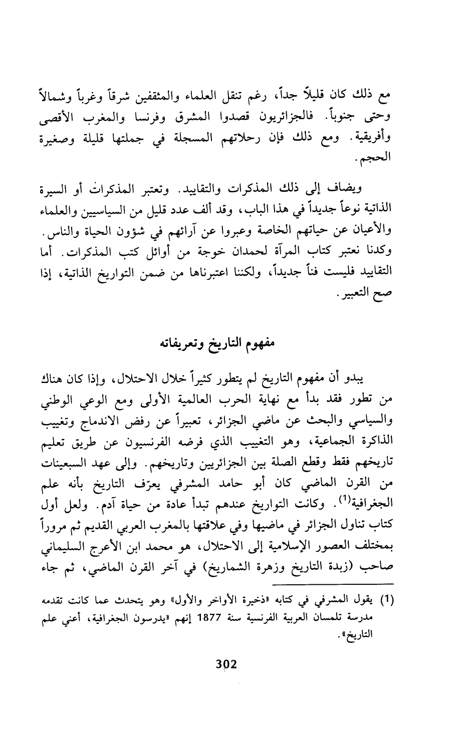 (¬1) يقول المشرفي في كتابه (ذخيرة الأواخر والأول) وهو يتحدث عما كانت تقدمه مدرسة تلمسان العربية الفرنسية سنة 1877 إنهم (يدرسون الجغرافية، أعني علم التاريخ).