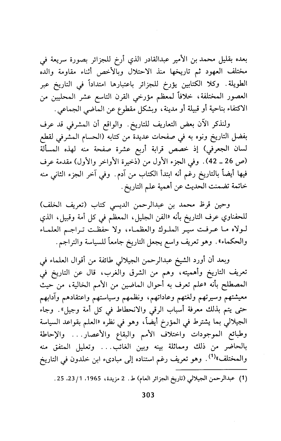 وبعد أن أورد الشيخ عبد الرحمن الجيلالي طائفة من أقوال العلماء في تعريف التاريخ وأهميته، وهم من الشرق والغرب، قال عن التاريخ في المصطلح بأنه (علم تعرف به أحوال الماضين من الأمم الخالية، من حيث معيشتهم وسيرتهم ولغتهم وعاداتهم، ونظمهم وسياستهم واعتقادهم وآدابهم حتى يتم بذلك معرفة أسباب الرقي والانحطاط في كل أمة وجيل). وجاء الجيلالي بما يشترط في المؤرخ أيضا، وهو في نظره (العلم بقواعد السياسة وطبائع الموجودات واختلاف الأمم والبقاع والأعصار ... والإحاطة بالحاضر من ذلك ومماثلة بينه وبين الغائب ... وتعليل المتفق منه والمختلف) (¬1). وهو تعريف رغم استناده إلى مبادئ ابن خلدون في التاريخ