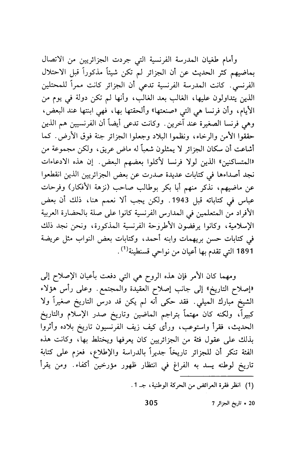وأمام طغيان المدرسة الفرنسية التي جردت الجزائريين من الاتصال بماضيهم كثر الحديث عن أن الجزائر لم تكن شيئا مذكورا قبل الاحتلال الفرنسي. كانت المدرسة الفرنسية تدعي أن الجزائر كانت ممرا للمحتلين الذين يتداولون عليها، الغالب بعد الغالب، وأنها لم تكن دولة في يوم من الأيام، وأن فرنسا هي التي (صنعتها) وألحقتها بها، فهي ابنتها عند البعض، وهي فرنسا الصغيرة عند آخرين. وكانت تدعى أيضا أن الفرنسيين هم الذين حققوا الأمن والرخاء، ونظموا البلاد وجعلوا الجزائر جنة فوق الأرض. كما أشاعت أن سكان الجزائر لا يمثلون شعبا له ماض عريق، ولكن مجموعة من (المتساكنين) الذين لولا فرنسا لأكلوا بعضهم البعض. إن هذه الادعاءات نجد أصداءها في كتابات عديدة صدرت عن بعض الجزائريين الذين انقطعوا عن ماضيهم، نذكر منهم أبا بكر بوطالب صاحب (نزهة الأفكار) وفرحات عباس في كتاباته قبل 1943. ولكن يجب ألا نعمم هنا، ذلك أن بعض الأفراد من المتعلمين في المدارس الفرنسية كانوا على صلة بالحضارة العربية الإسلامية، وكانوا يرفضون الأطروحة الفرنسية المذكورة، ونحن نجد ذلك في كتابات حسن بريهمات وابنه أحمد، وكتابات بعض النواب مثل عريضة 1891 التي تقدم بها أعيان من نواحي قسنطينة (¬1).